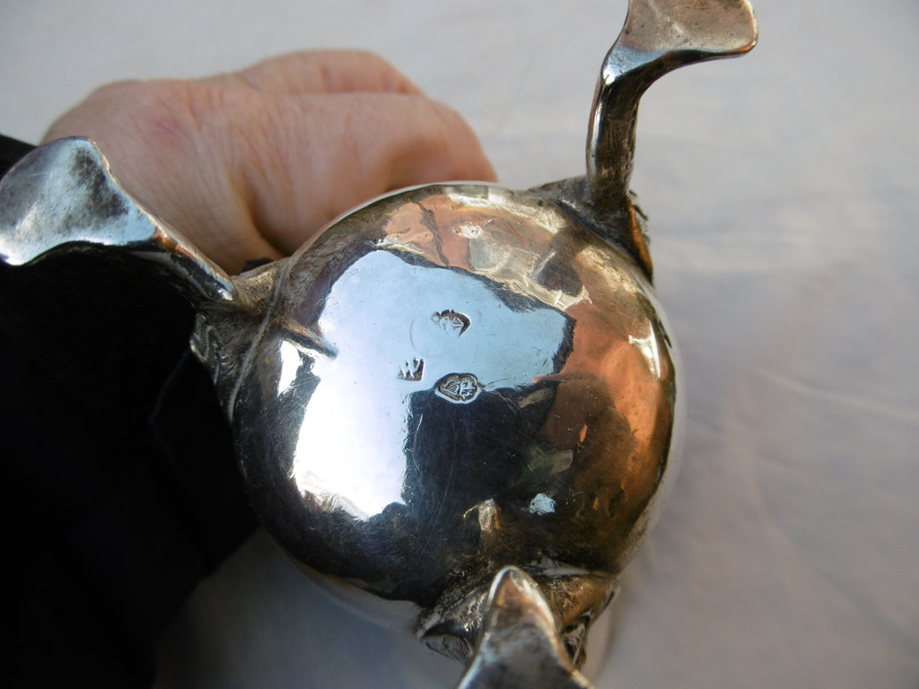 This is a lovely jug made in Dublin in c1740 probably by Samuel Walker, it is a very good condition, really well made, the hallmarks are Hibernia , Harp and part of the maker ?W I am pretty sure its Walker, it has 3 lovely Lions head cast legs and a nice cast handle, it is 11cms high and weighs 180 grams