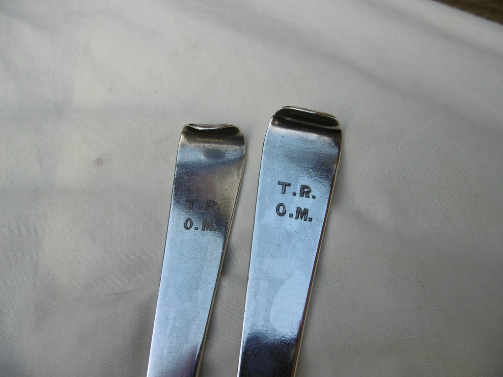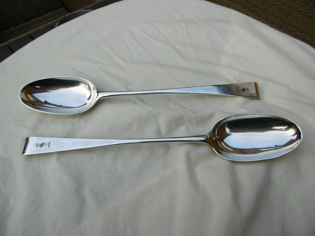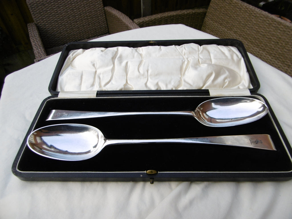 This is a fine pair of spoons made in Dublin in 1770 by John Locker, they are in excellent condition, they look unused, very clear hallmarks they are the rare hook end type, they has a crest on the front and owners initials on the back of the handle, they are 29cms long and weigh 220 grams the pair, they are in a lovely fitted box.