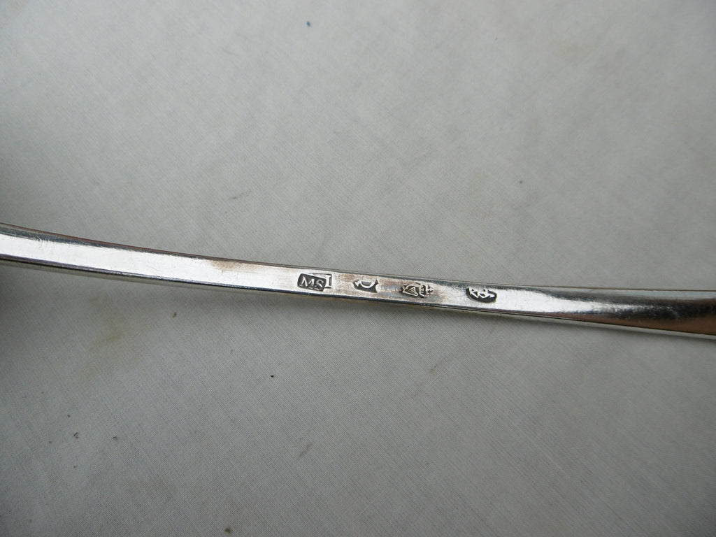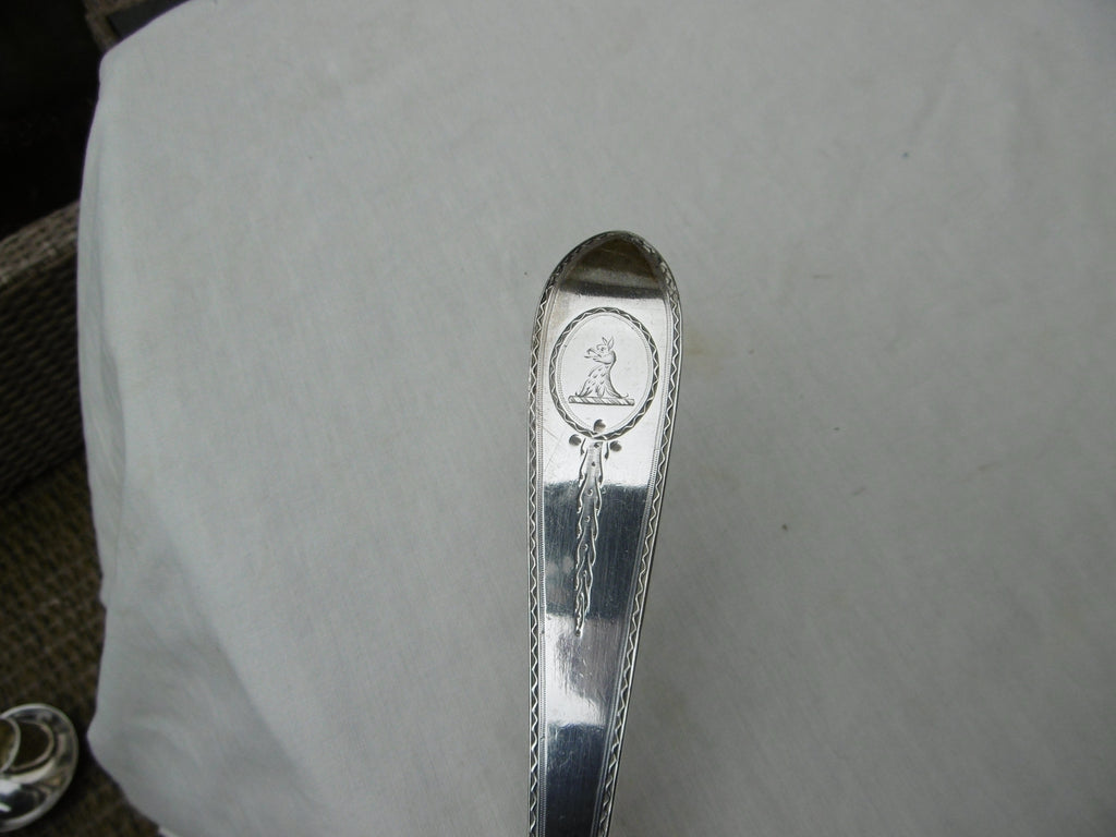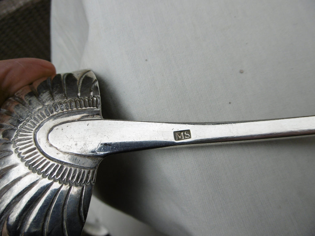This is a top quality ladle made in Dublin in 1788 by maker MS probably Michael Smith, his mark is struck twice but one is over striking another makers mark, all the hallmarks are clear, it has a lovely shell bowl, it has crisp bright cut edge decoration and a wonderful period crest, it is 38cms long and weighs 200 grams