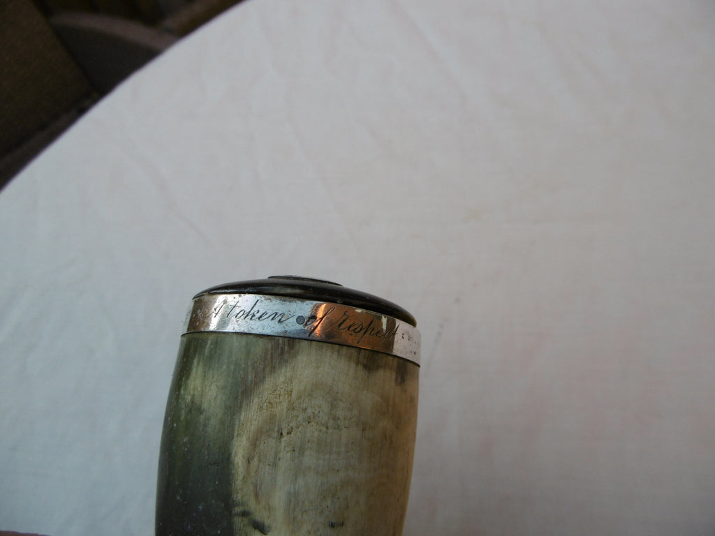 This is a lovely snuff mull made in Scotland in c1800, it is in very good condition with unmarked silver mounts engraved with a token of respect , what makes this special is the Seals head moulded on the tip , see photos, it is 9cms long