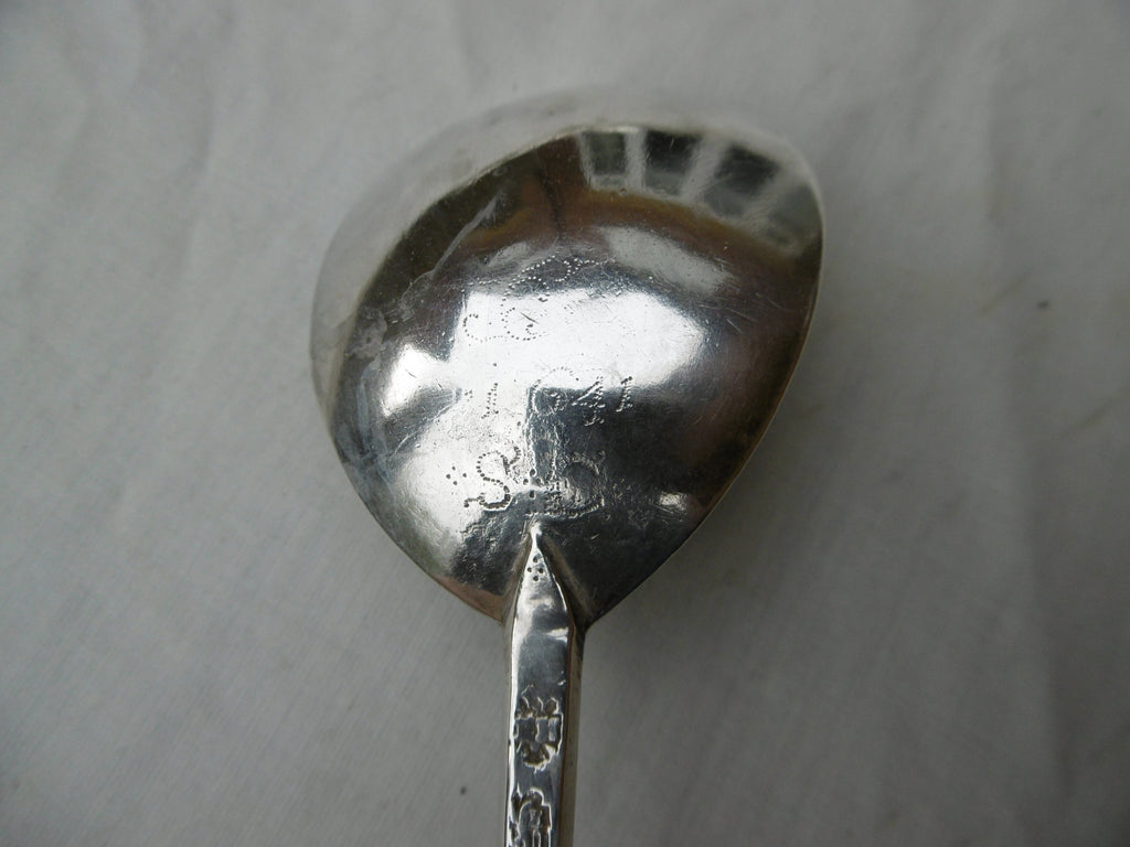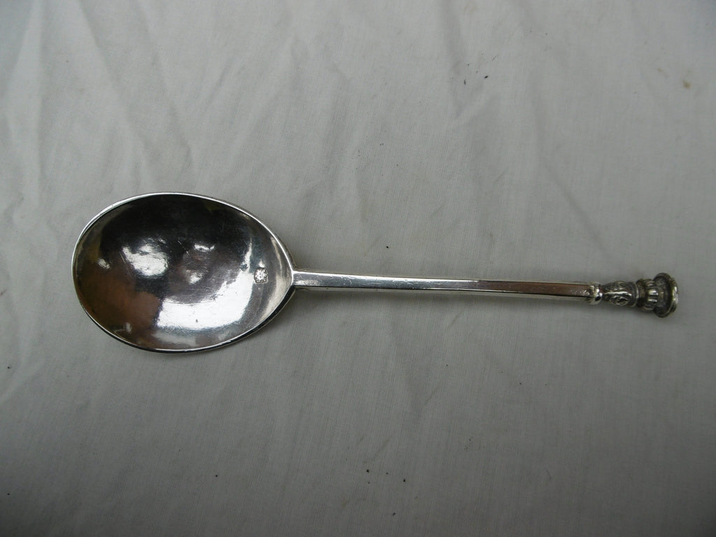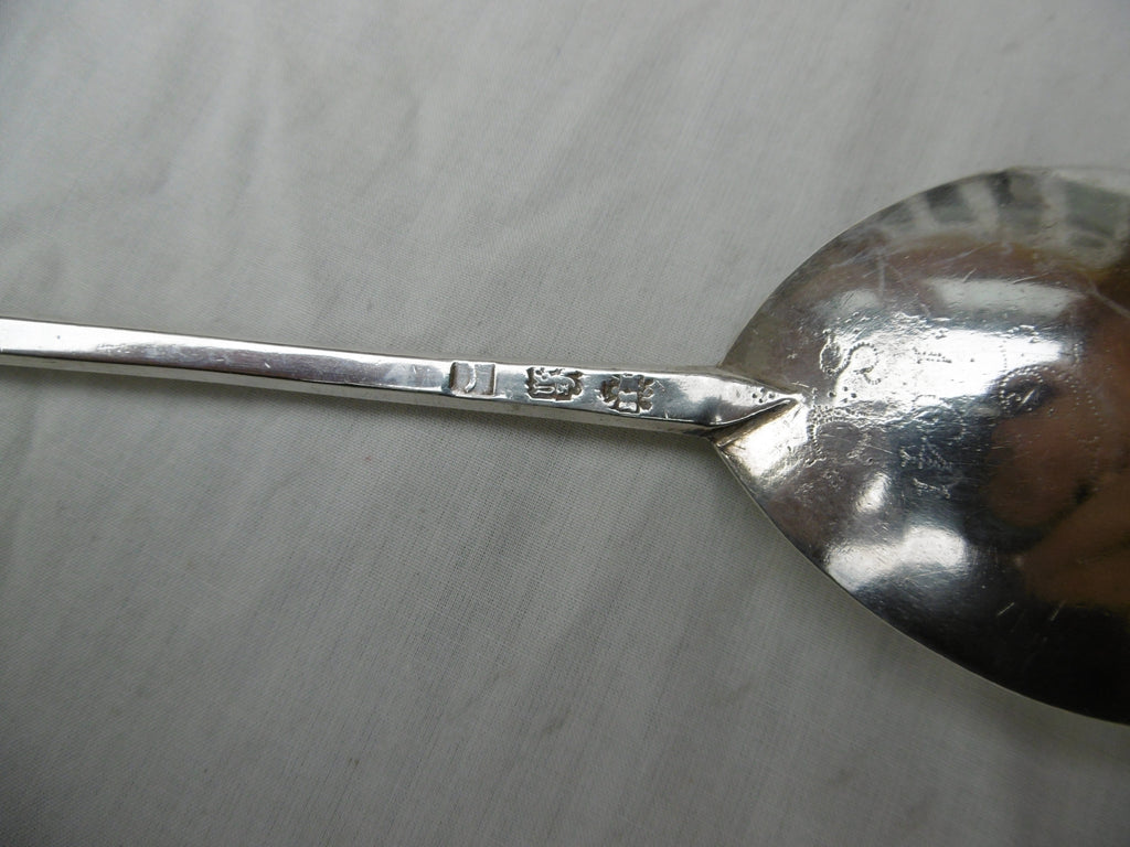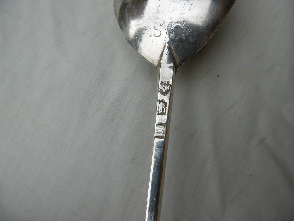 This is a top quality spoon made in London in 1628 by Edward Hole, it is in very good condition, very clear hallmarks , unworn bowl , it has period owners prick dot initials SG dated 1641 on the back of the bowl and GP on the seal. It is 17cms long and weighs 48 grams.