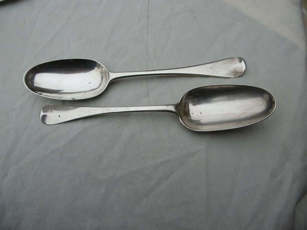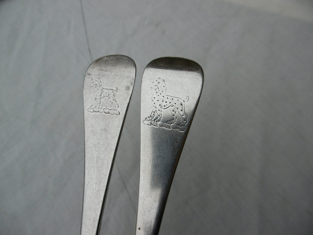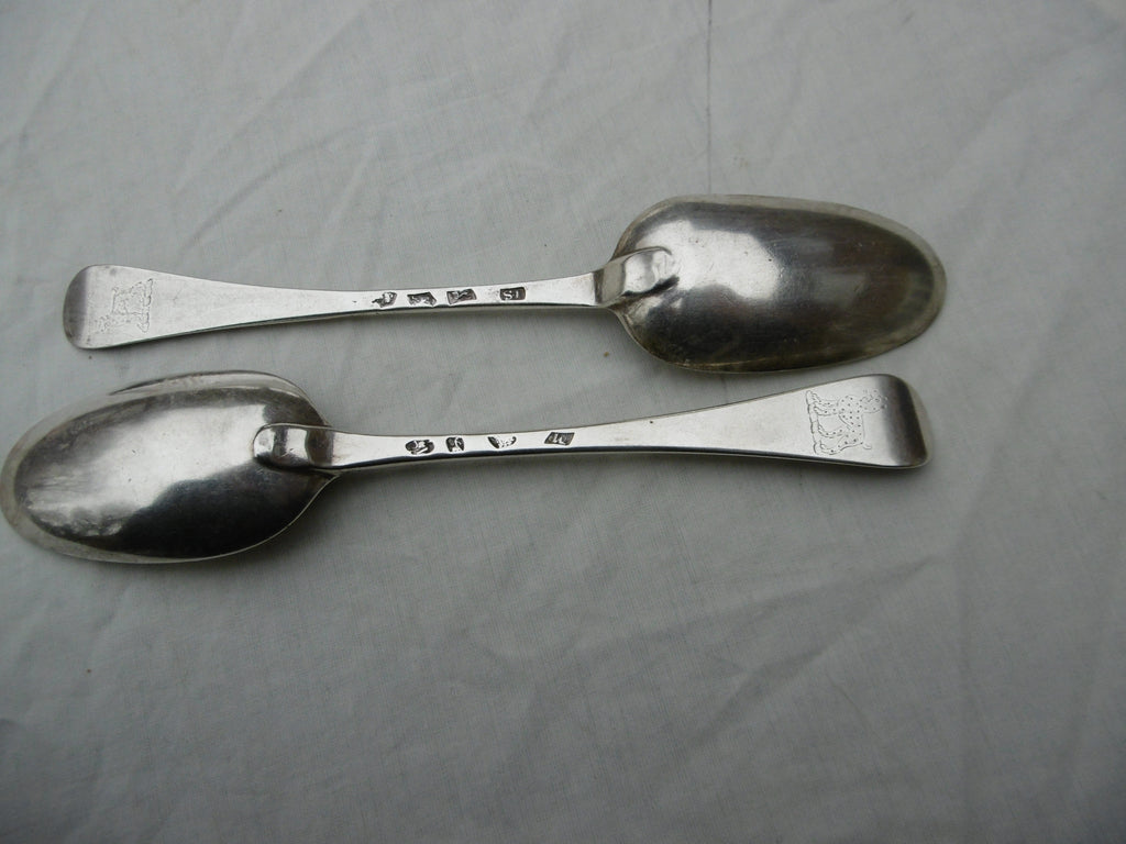 1727 fine pair of George 1st spoons by maker IS great Dog crest 130g