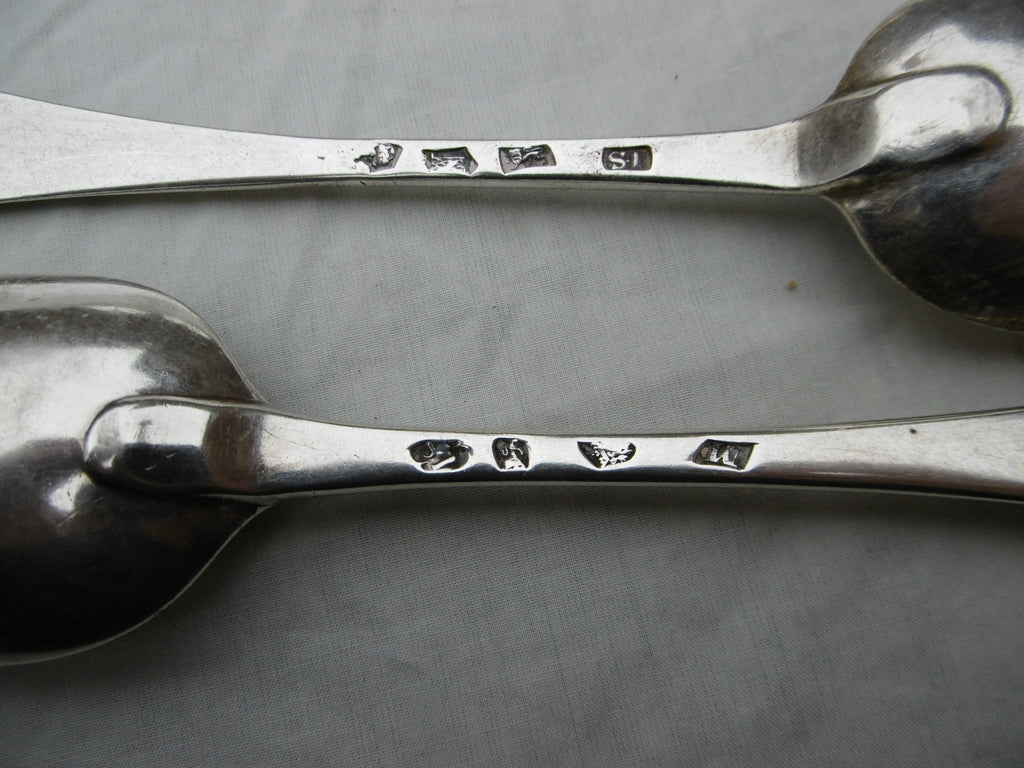 This is a lovely pair of spoons made in London in 1727 by maker IS. They are in very good condition , good hallmarks , they are 20cms long and weigh 130 grams the pair. They both have a period Dog crest , both Dogs are slightly different.