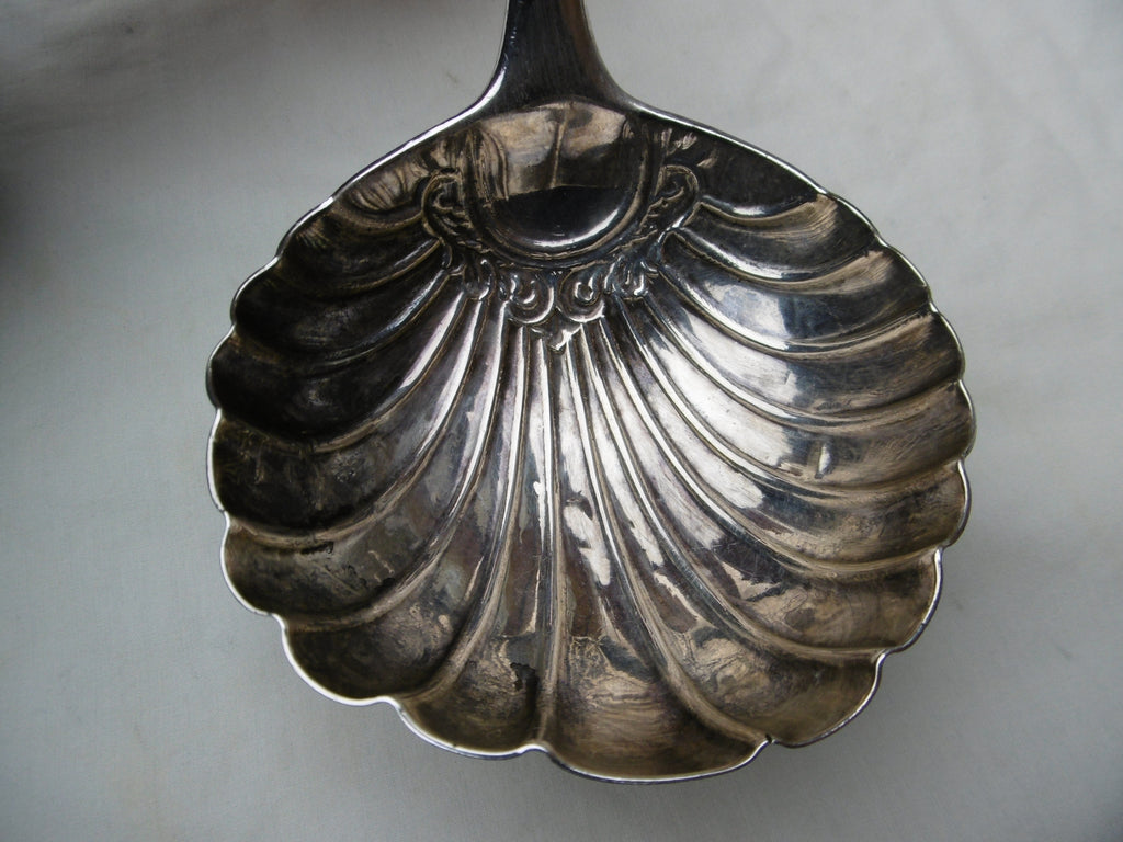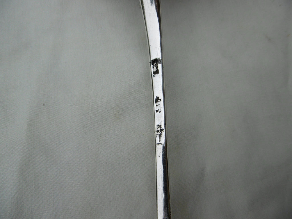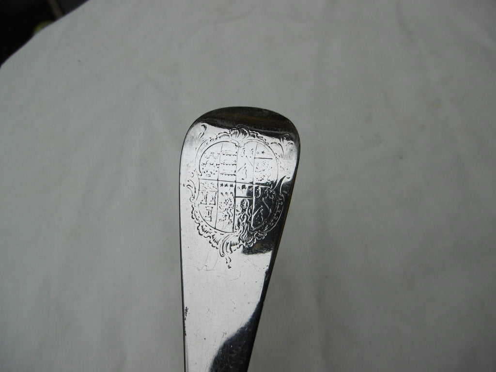 This is a lovely soup ladle made in London c1750, it is in very good condition, the hallmarks are squashed, I can see the Lion , Crowned Leopards head and part of the makers mark, it has a fine rococo shell bowl, what makes this a bit special is the beautiful period Armorial crest, see photos , it is 34cms long and weighs 165 grams