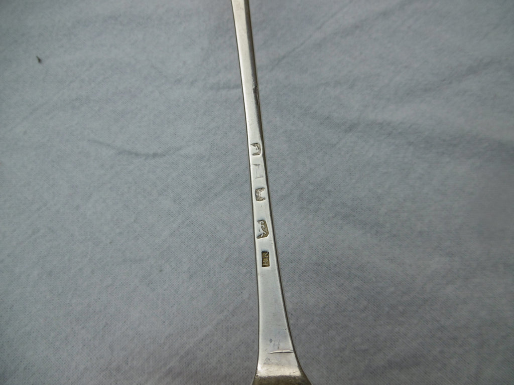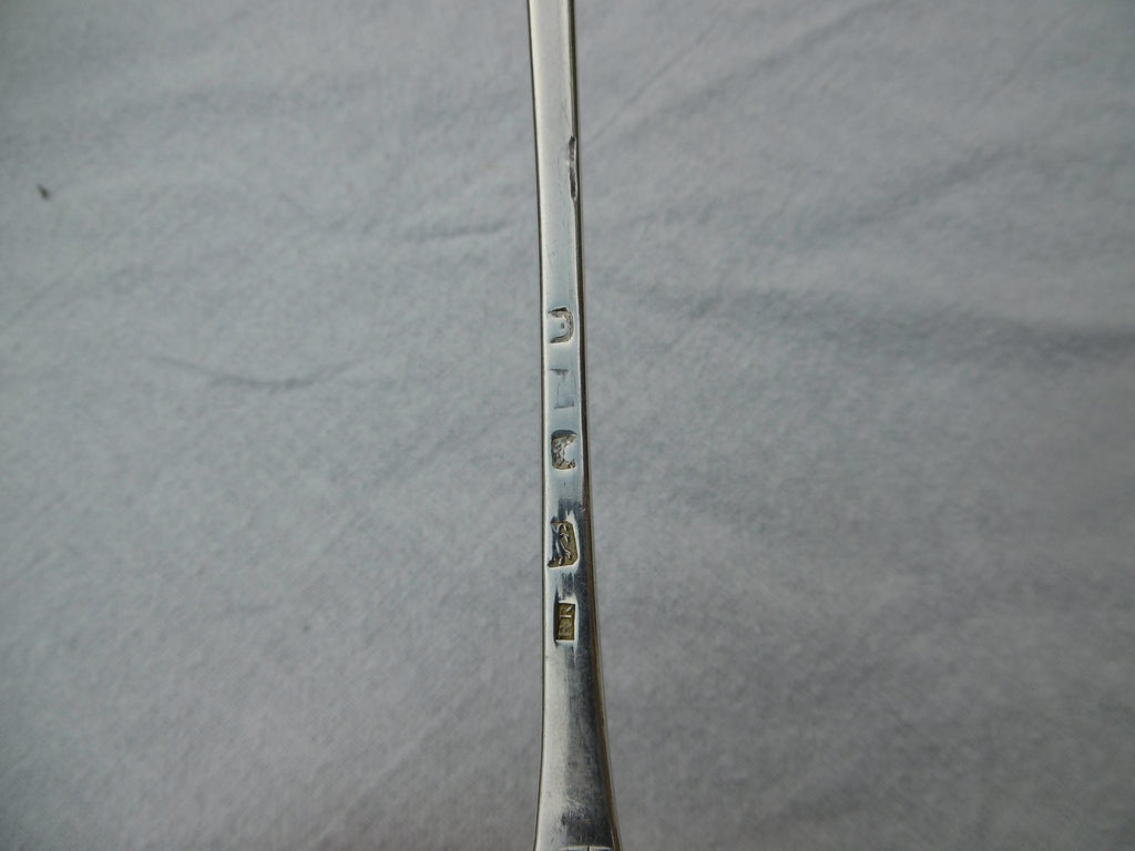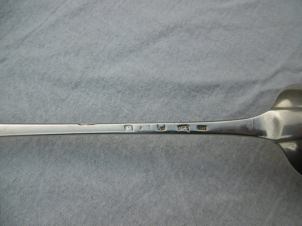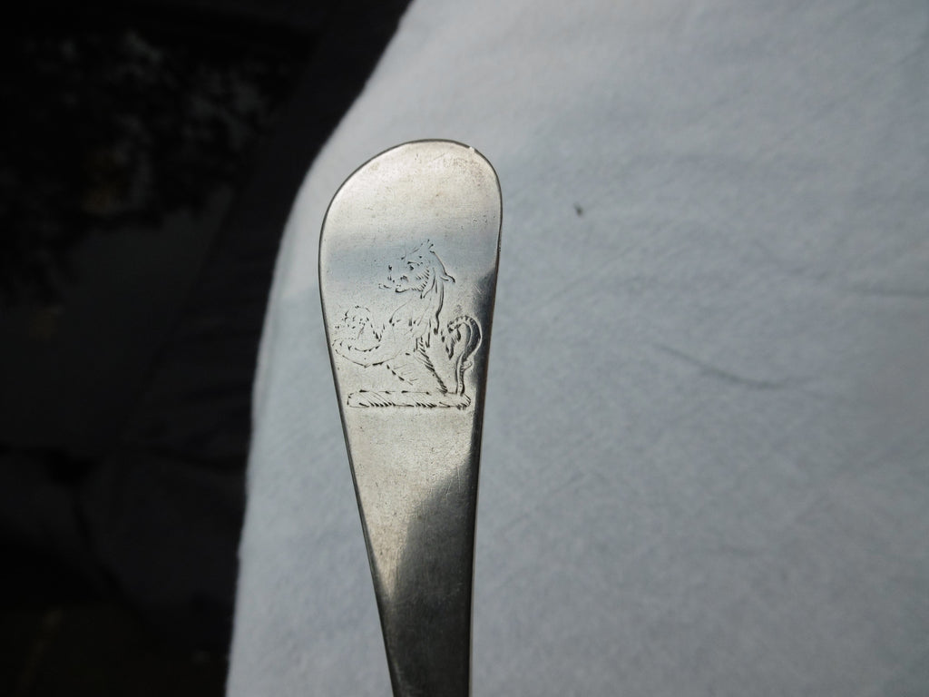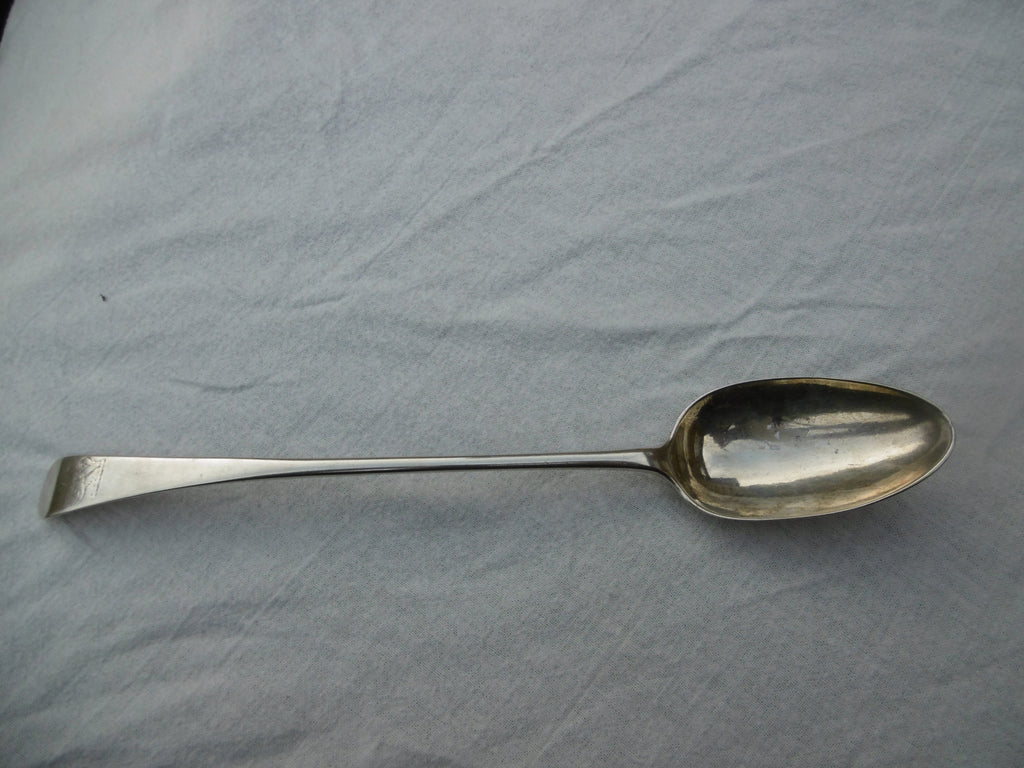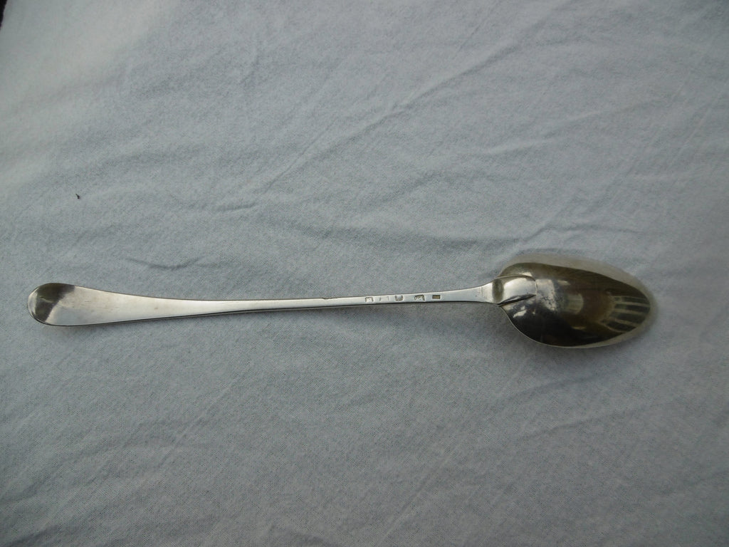 This is a rare basting spoon made in Chester in 1776 by Richard Richardson 1V. It is in very good condition, unworn bowl, very good makers mark, the date letter a is a bit rubbed but readable. It is 30cms long and weighs 90 grams, it has a lovely period Lion crest.
