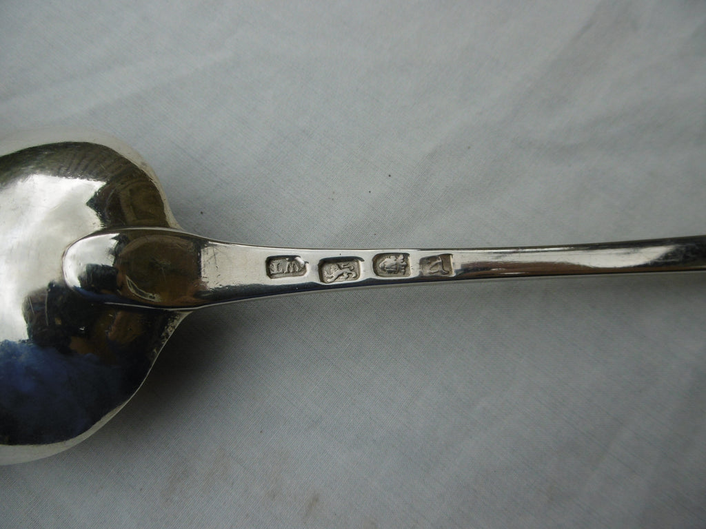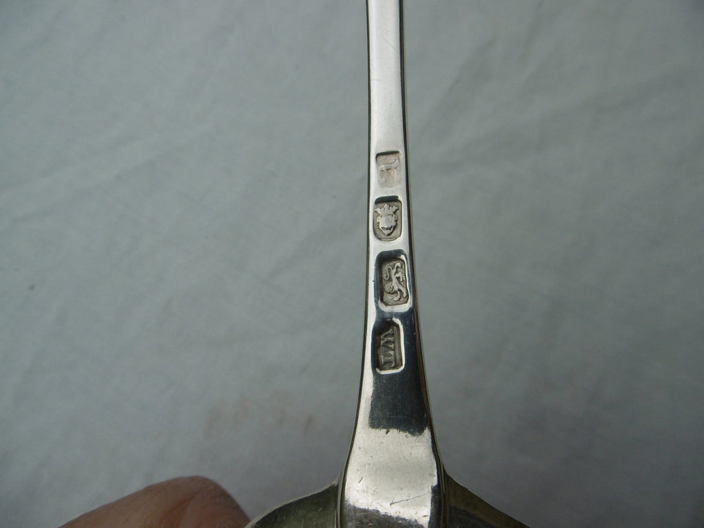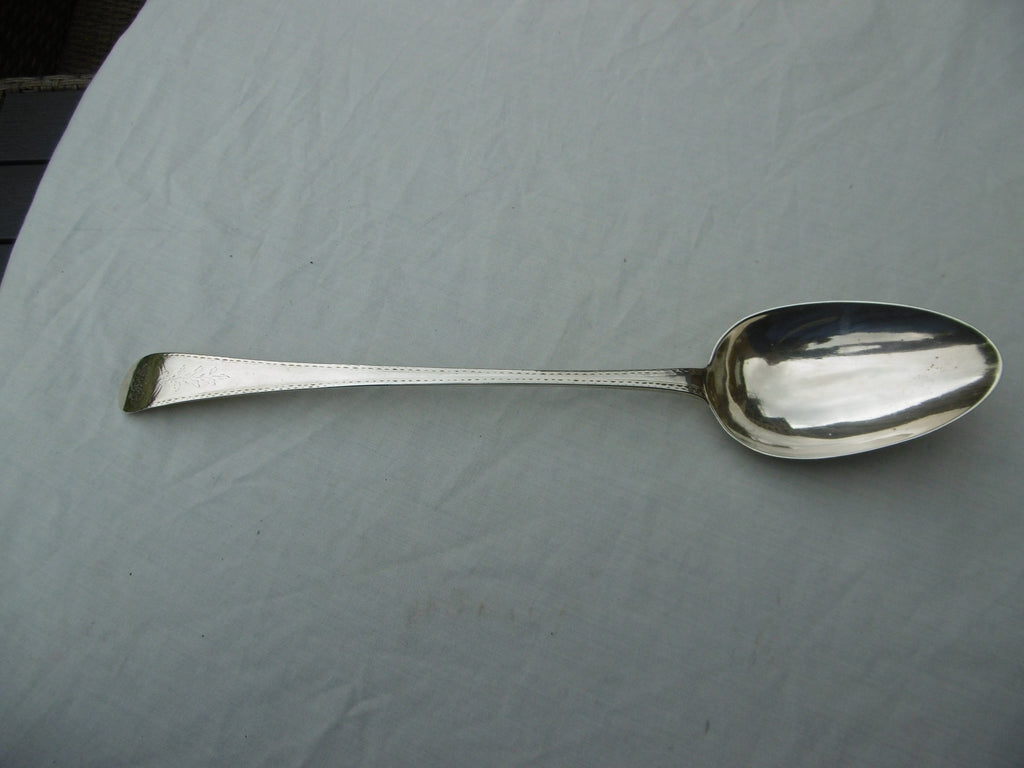 This is a really nice spoon made in London in 1776 by Walter Tweedie. It is in very good condition, fine bowl and very clear hallmarks. It has lightly rubbed bright cut edge decoration and owners initials in script. It is 30cms long and weighs 96 grams