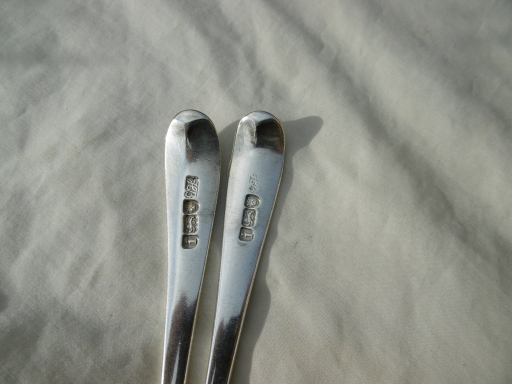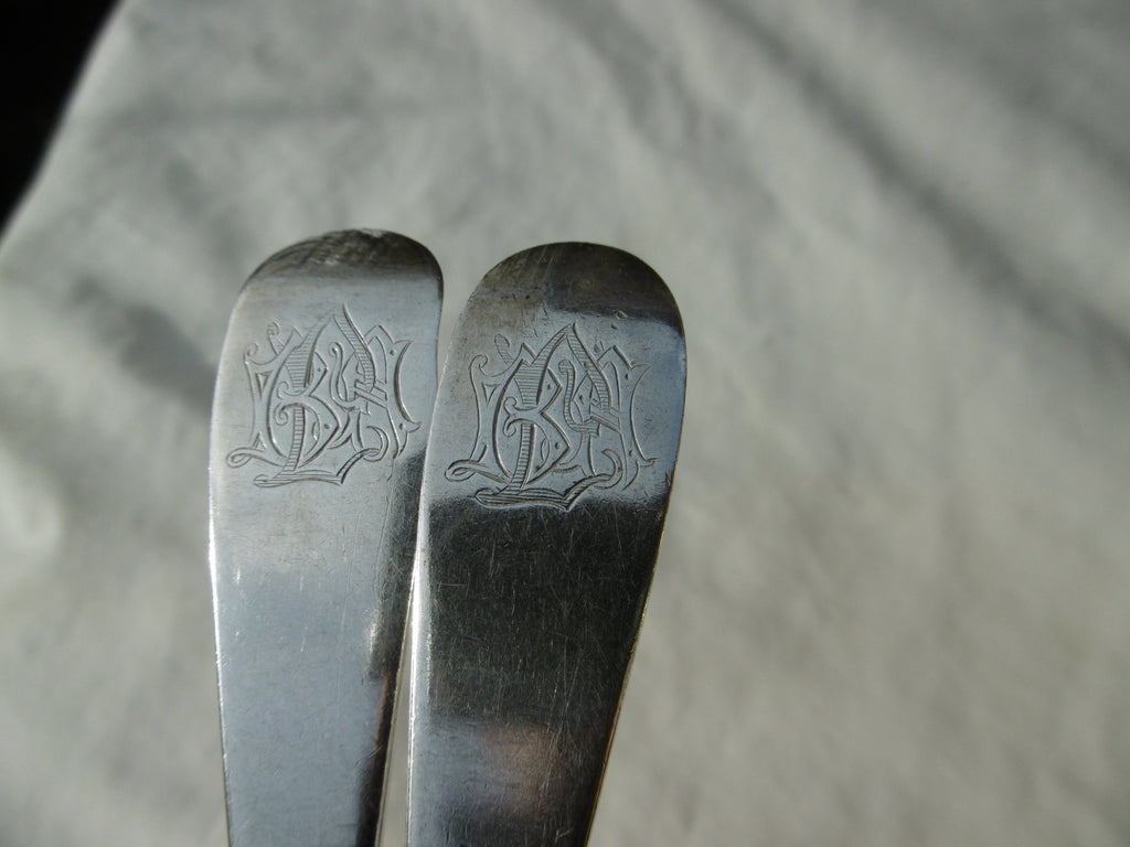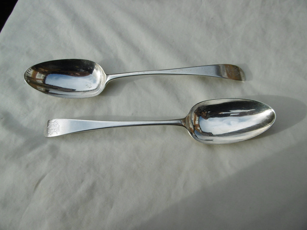 This is a fine pair of spoons made in London in 1784 by Hester Bateman. They are in very good condition, very clear hallmarks and unworn bowls, they are 22cms long and weigh a heavy 134 grams the pair, they have owners initials on the handle. I currently have 4 of these if you require more please let me know.