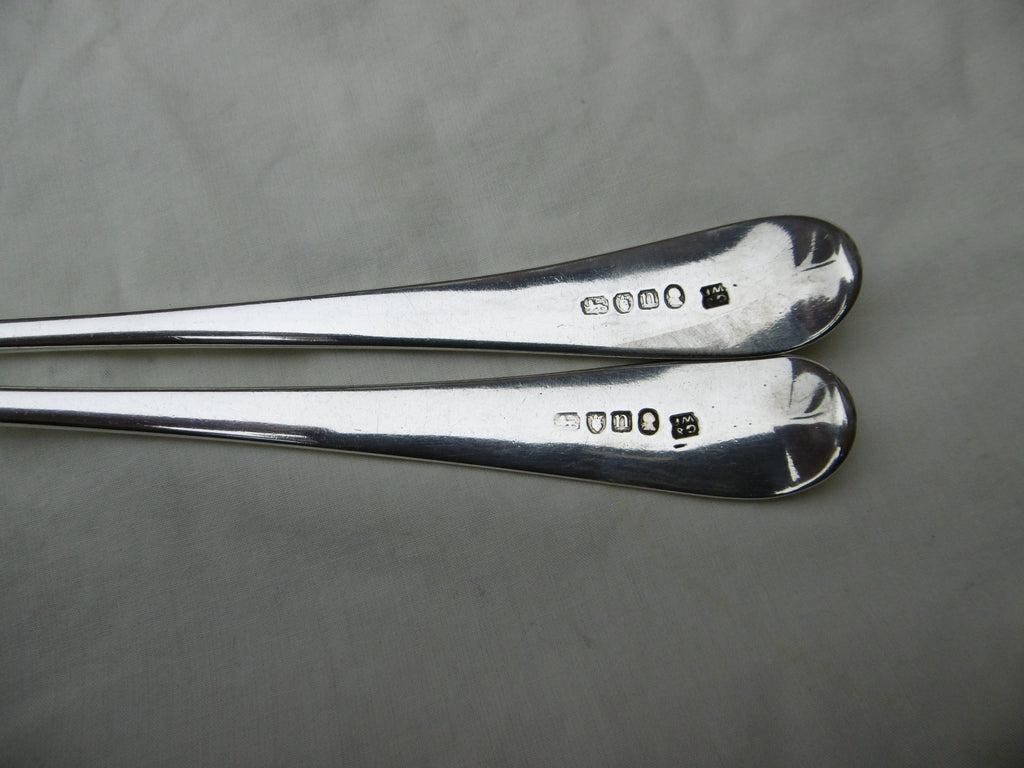 This is a lovely pair of spoons made in London in 1788 by Smith and Fearn, they are in very good condition, unworn bowls , nice clear hallmarks, they are 29cms long and weigh 185 grams the pair, they have period owners initials in script.