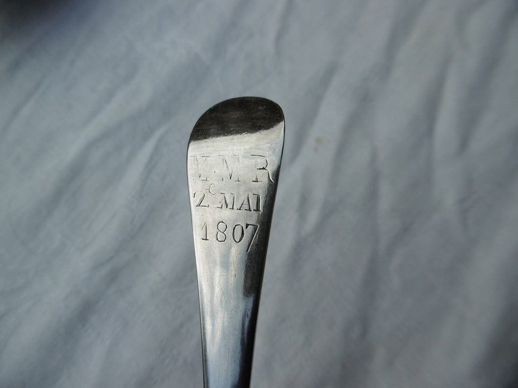This is a really nice spoon made in Jersey c1807 by George Mauger. It is in very good condition, very good makers mark, it has a good bowl , it is 20cms long and weighs 38 grams. It has period owners initials MMR dated 2 mai 1807 so probably a christening spoon