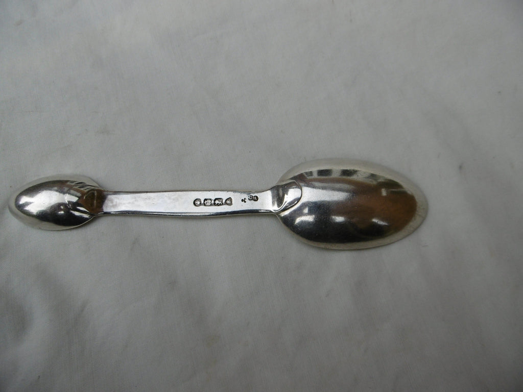 This is a lovely medicine spoon made in London in 1872 by George Adams, its in very good condition, nice clear hallmarks, unworn bowls, it has lovely decoration on the handle, it is 13cms long and weighs 27 grams.