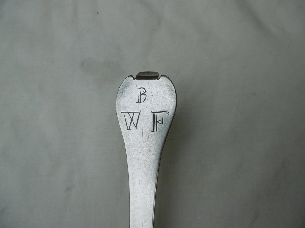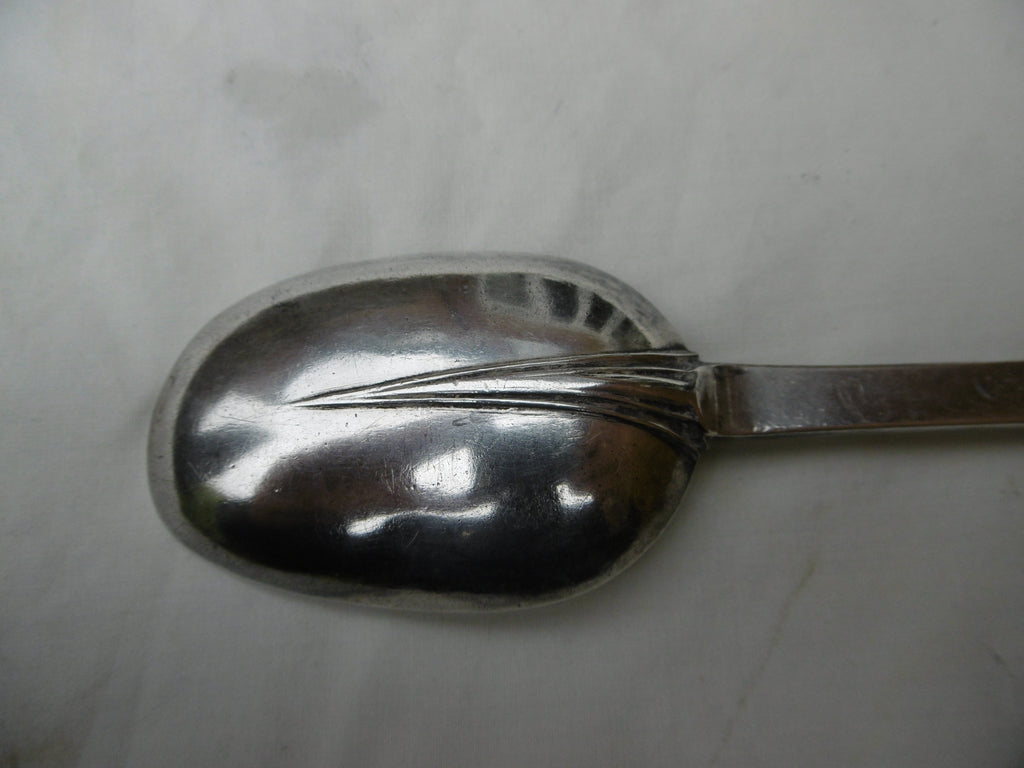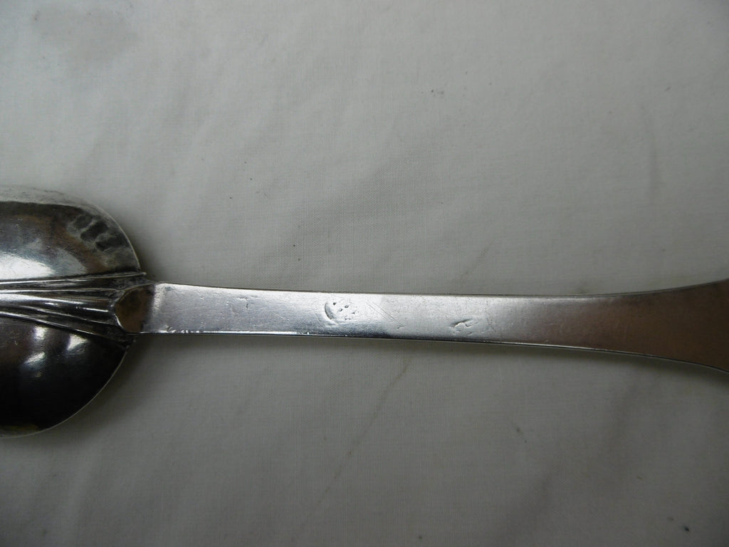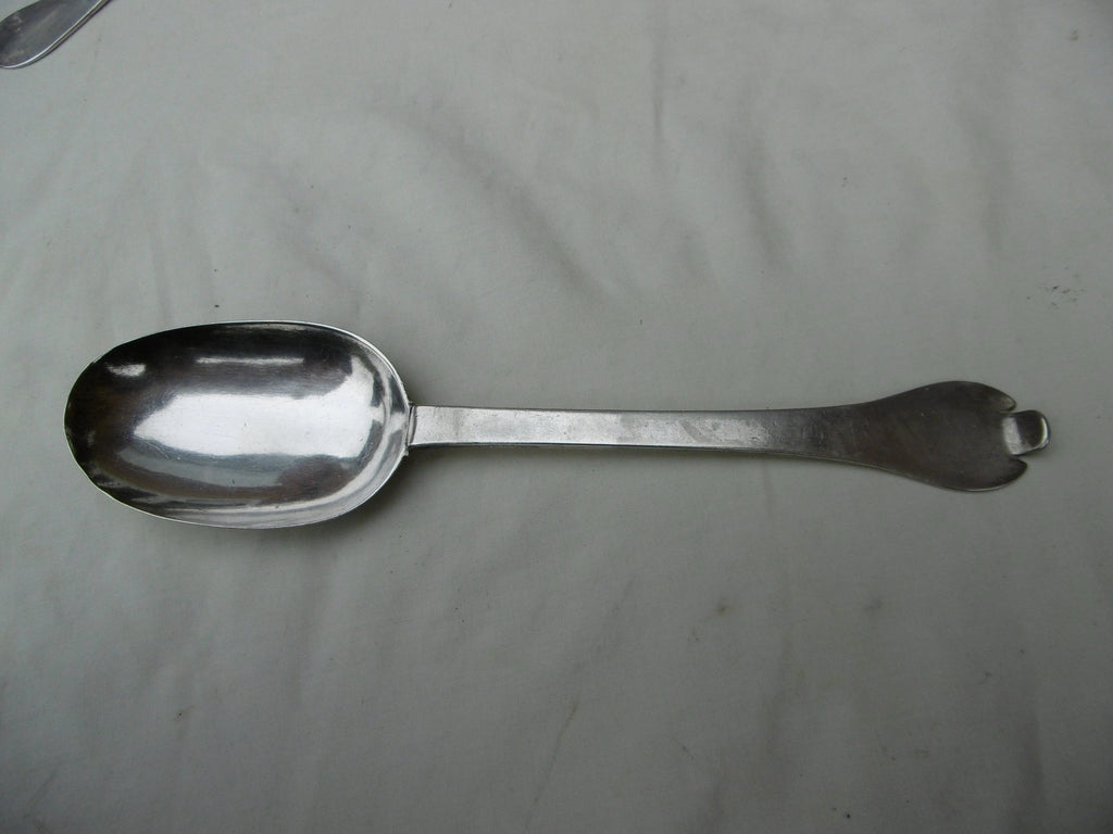 This is a lovely spoon made in c1690 in London, it is in very good condition, fine bowl and reeded rat tail. the hallmarks are rubbed, I can seen the Lion and Crowned Leopards head and part of the maker it could be Izzod, It is 20cms long and weighs 52 grams.