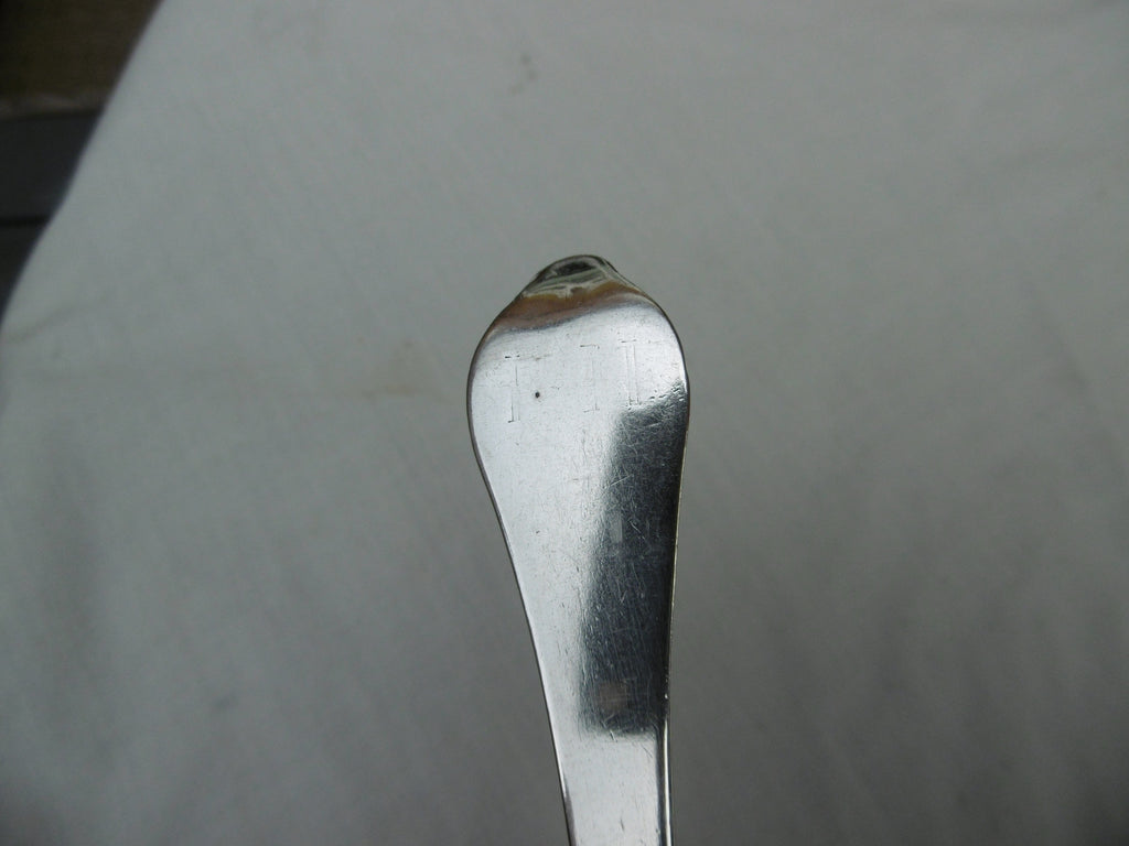 This is a lovely usable early spoon made in c1700, it has part of a very faint makers mark at the top of the handle and is provincial, it has a very good bowl and rat tail, it is 19cms long and weighs 55 grams, it has rubbed period owners initials IH.