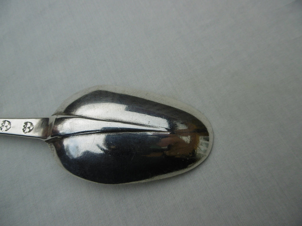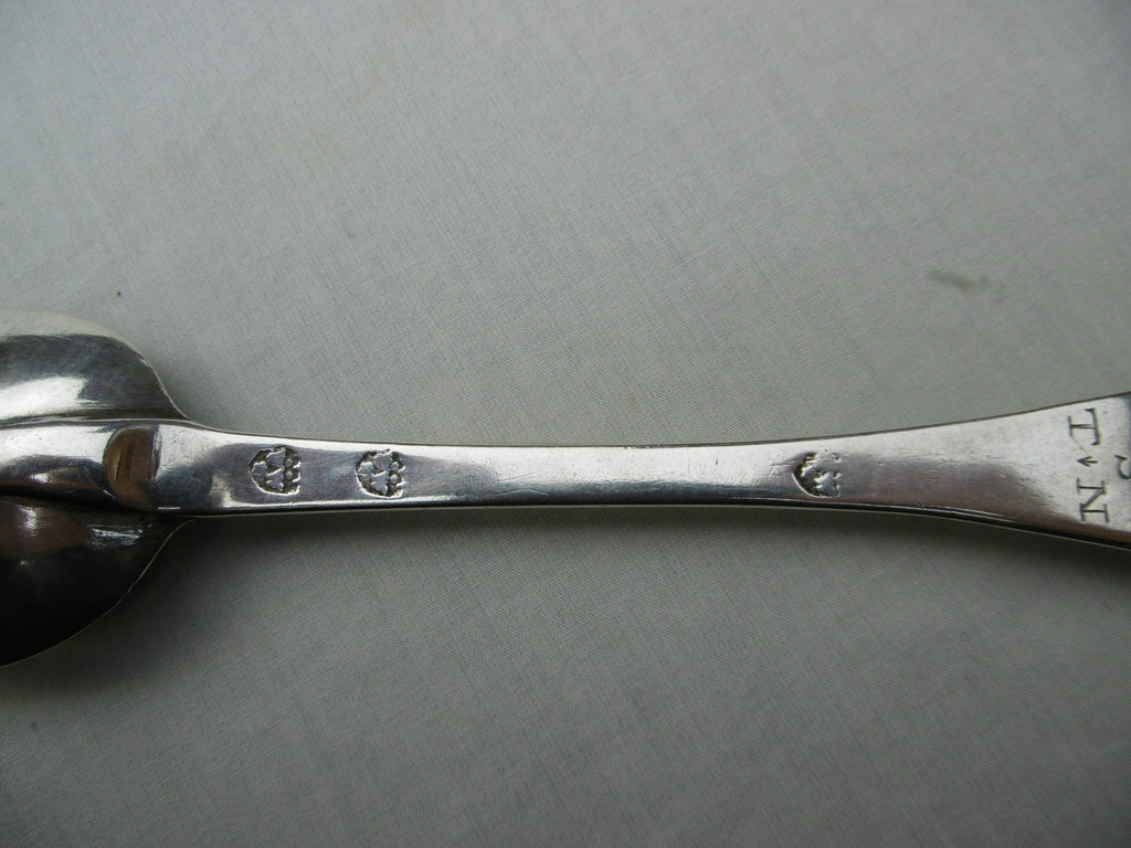 This is a fine spoon made in Winchester in c1713 by William Webb, it is in very good condition, good bowl and rat tail, it has the makers mark WW struck 3 times its also has period owners initials SM STM dated 1713. It is 18cms long and weighs 50 grams