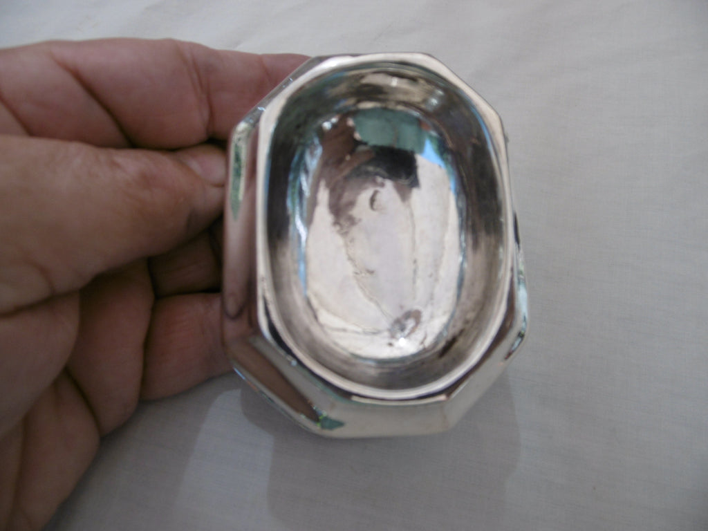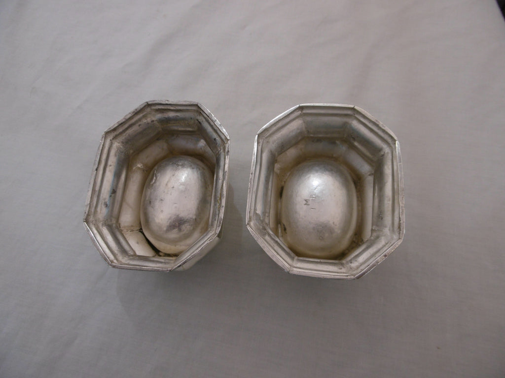 This is a lovely pair of early salts made in London in 1717. One is in very good condition with rubbed hallmarks but I can see the date letter B for 1717 , the second one has had some restoration in the bowl, they are 8cms long and weigh 95 grams the pair,