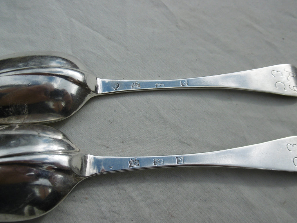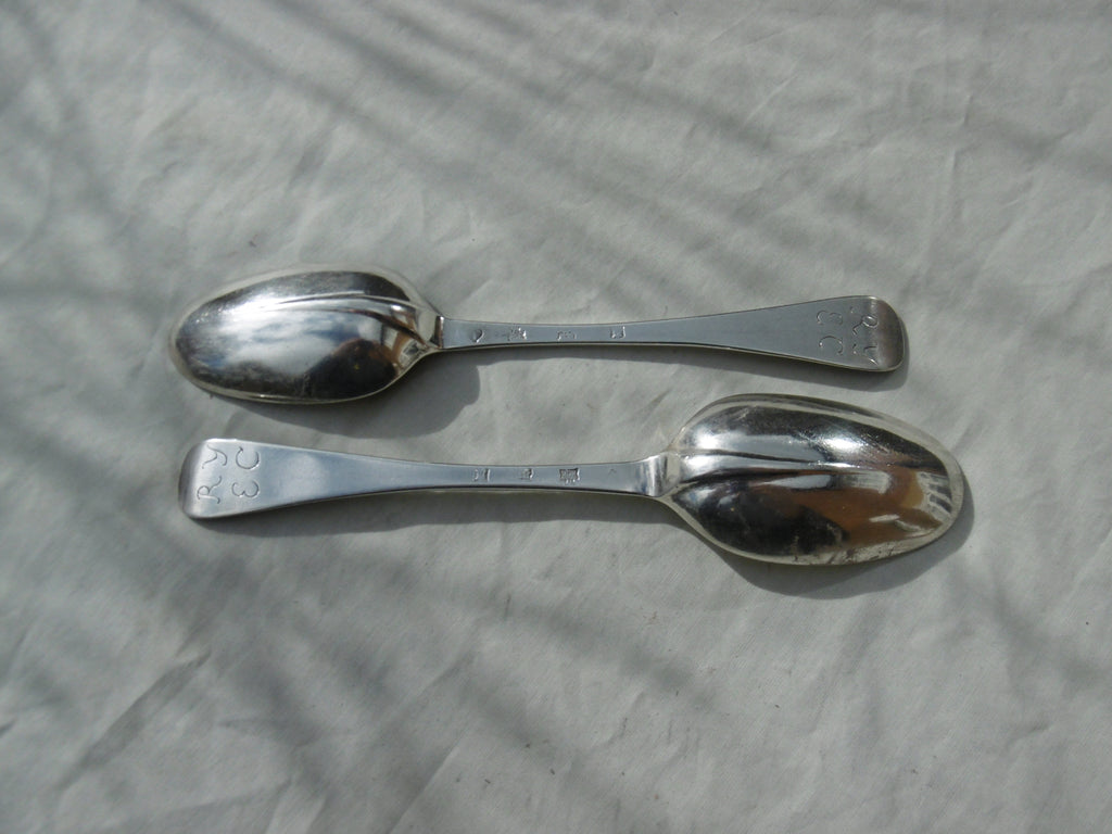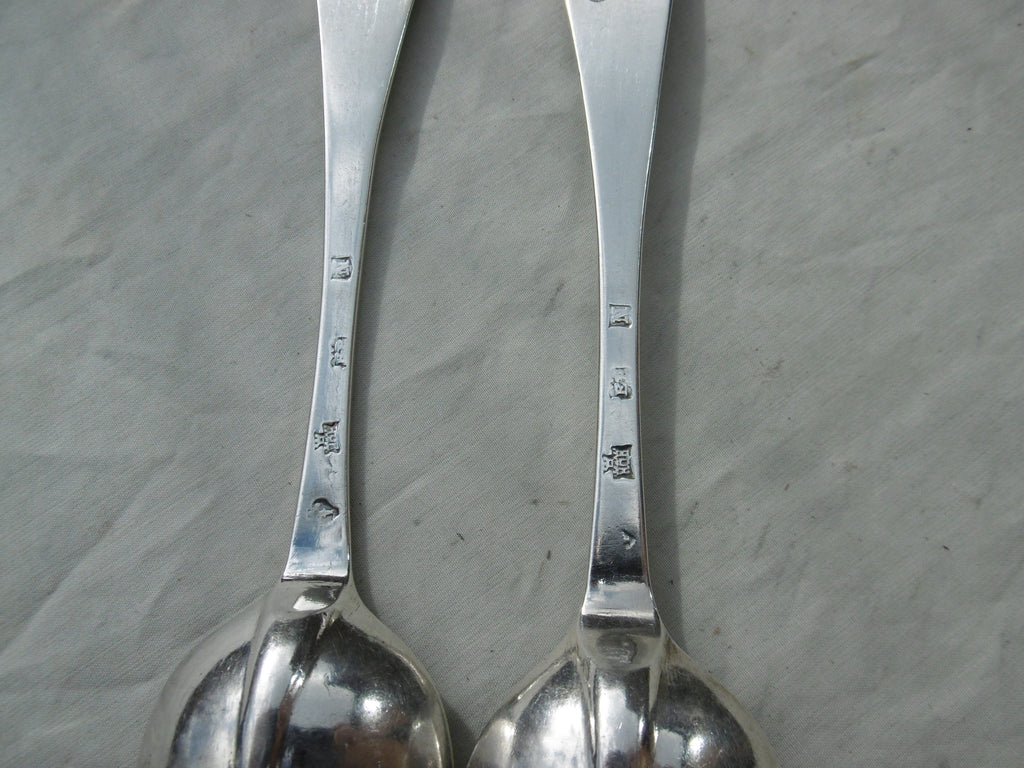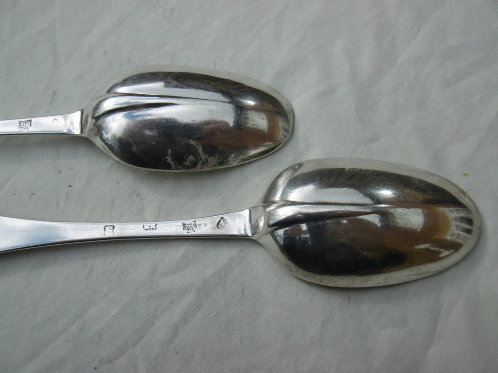 This a fine pair of spoons made in Edinburgh in 1717 by James Tait. They are in very good condition, very good bowls and rat tails, very good hallmarks, the maker is a bit squashed but readable. They are 20cms long and weigh a heavy 140 grams the pair, the have lovely period owners initials.