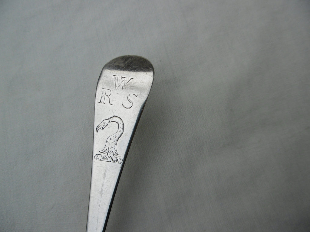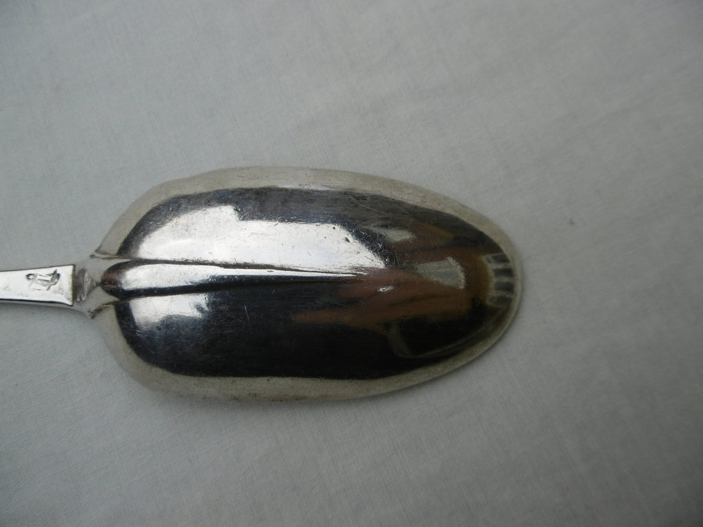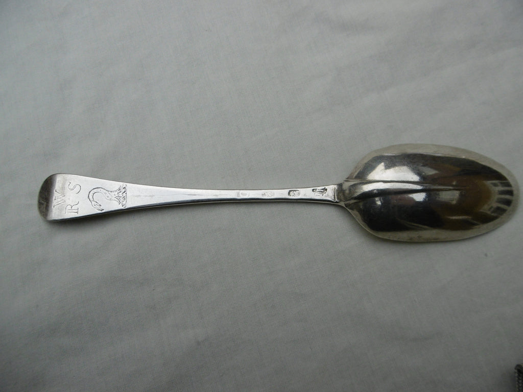 This is a really nice spoon made in London in 1718 by Henry Miller. It is in very good condition nice bowl and rat tail. The hallmarks are good maker, the date letter is a bit rubbed. It is 19.5cms long and weighs 46 grams. I has a really nice period crest and owners initials W over RS.