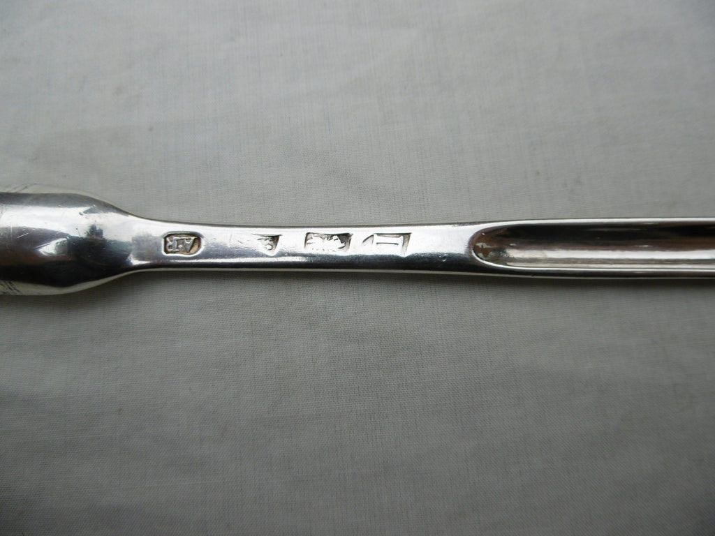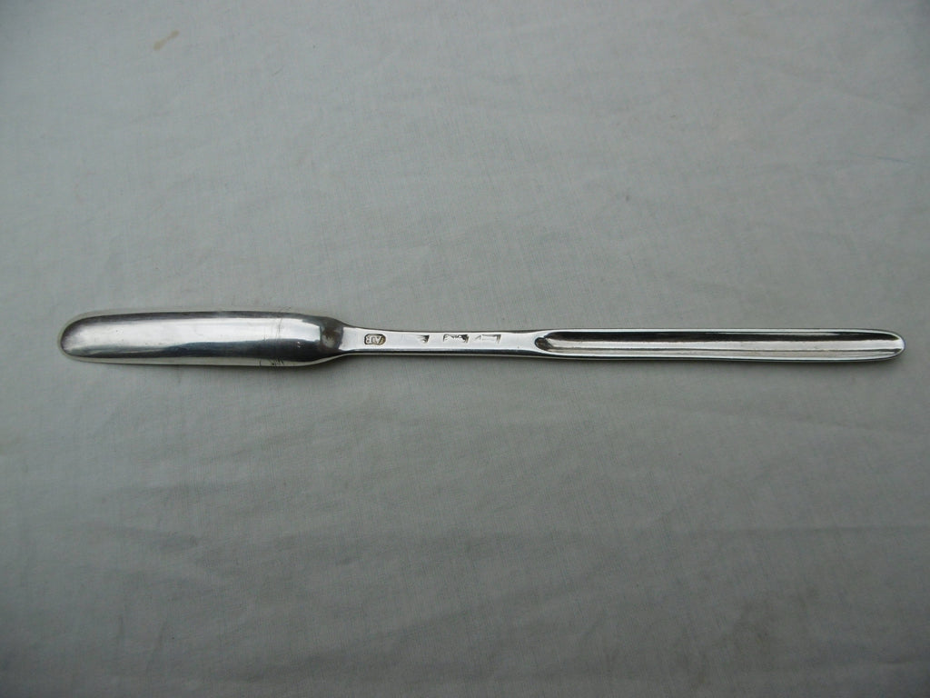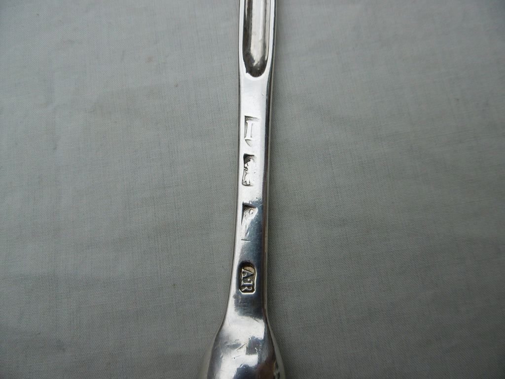 This a a rare marrow scoop made in London in 1719 by Andrew Archer. Its in very good condition, good readable makers mark and date letter, very nice unworn bowls. What makes this a bit special is the reverse bowls, an unusual feature only found on early 18th century scoops. It is a good size, 23cms long and weighs 52 grams.
