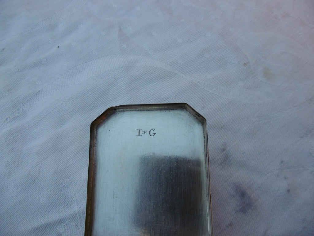 This is a very pretty snuff box made in c1720. It is typical of the era, very good period engraved decoration, the only hallmark is the maker, very rubbed and hard to read, inside it also has period owners initials PG. It has a later rubbed inscription under the base. It is 7cms long and weighs 56 grams