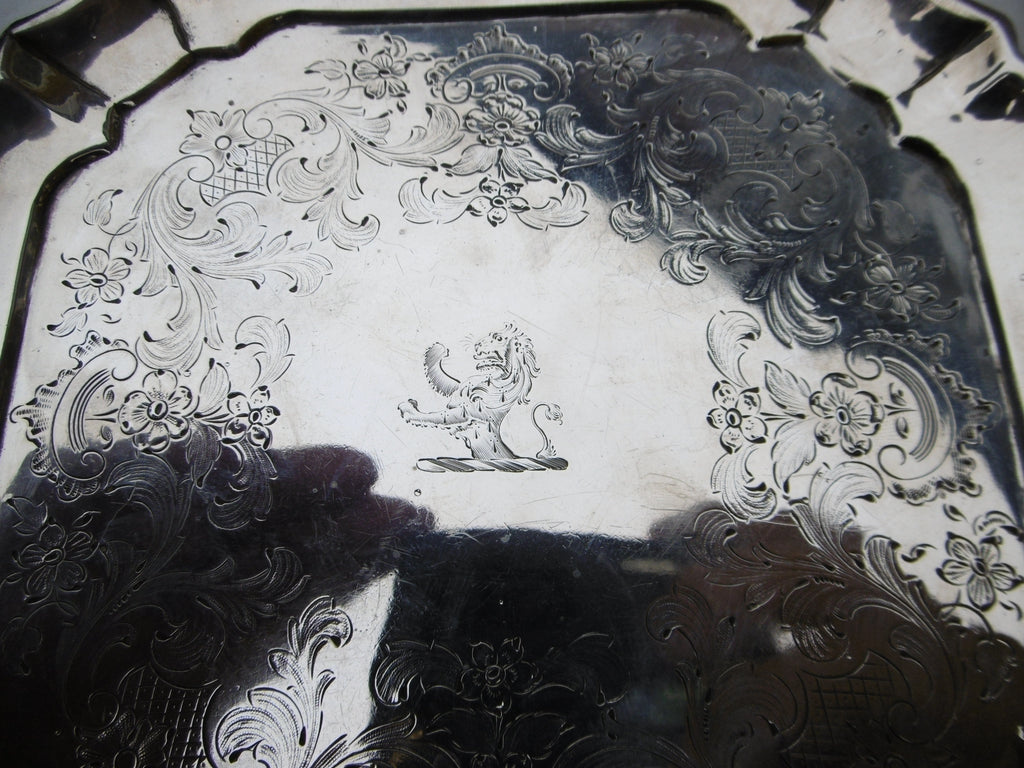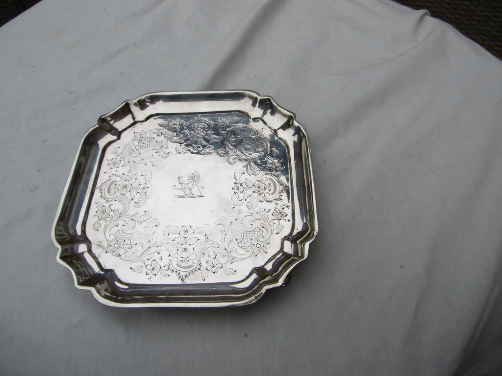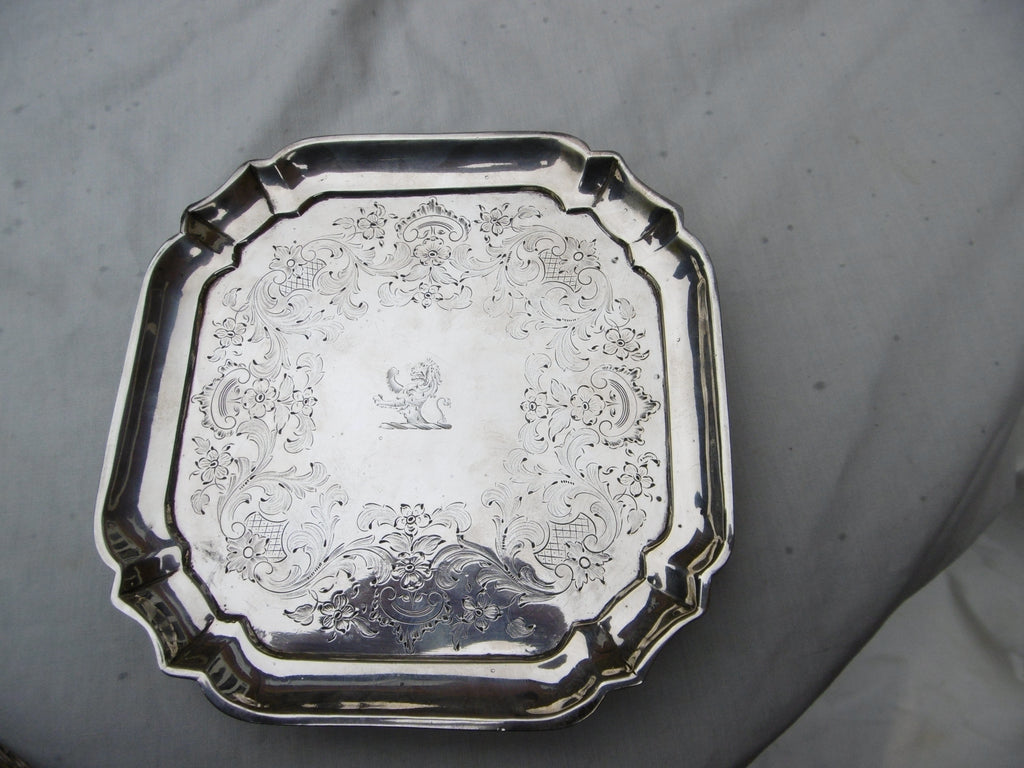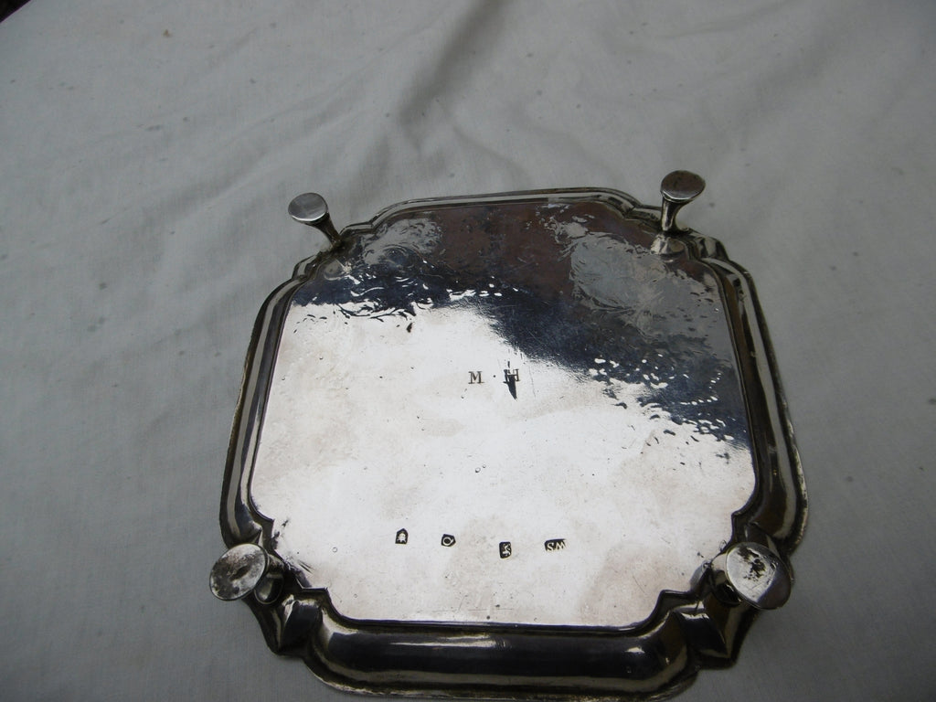 This is a lovely Georgian stand made in London in 1731 by William Soame, it is in very good condition, nice clear hallmarks , the square shape is quite rare , it is 16cms diameter and weighs 220 grams , it has the period crest of a Lion on top and owners initials MH underneath,