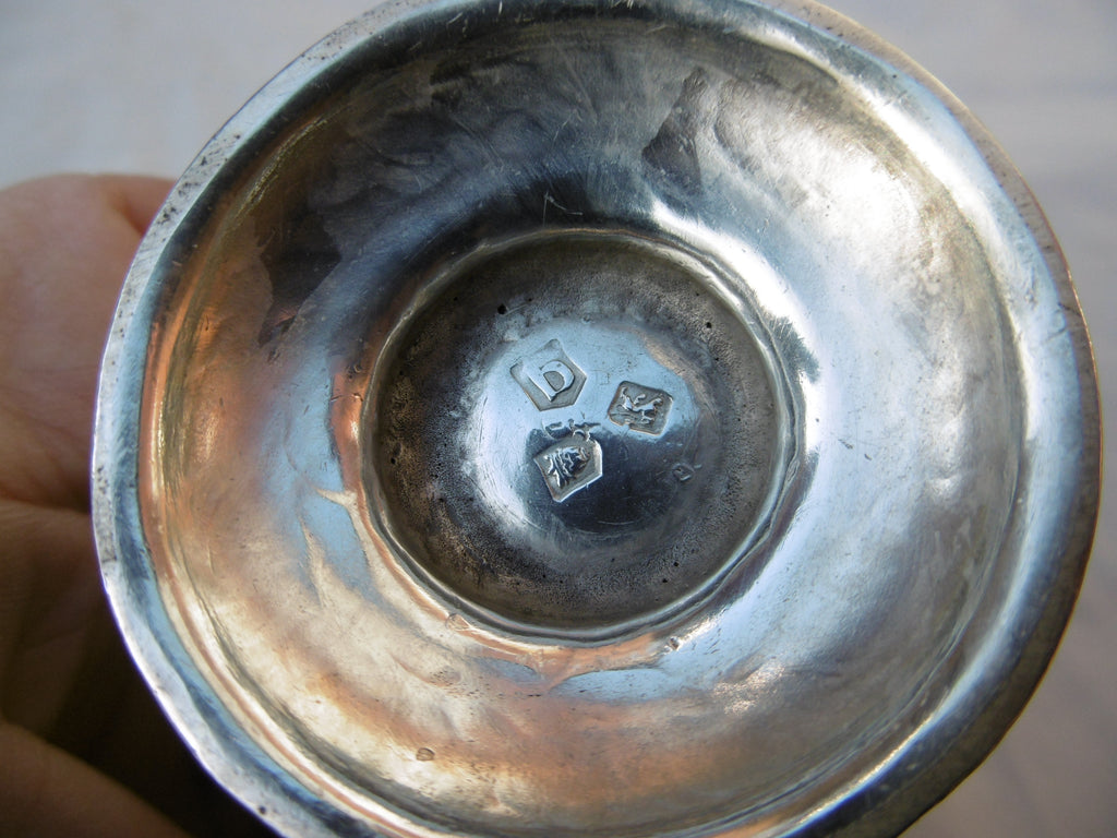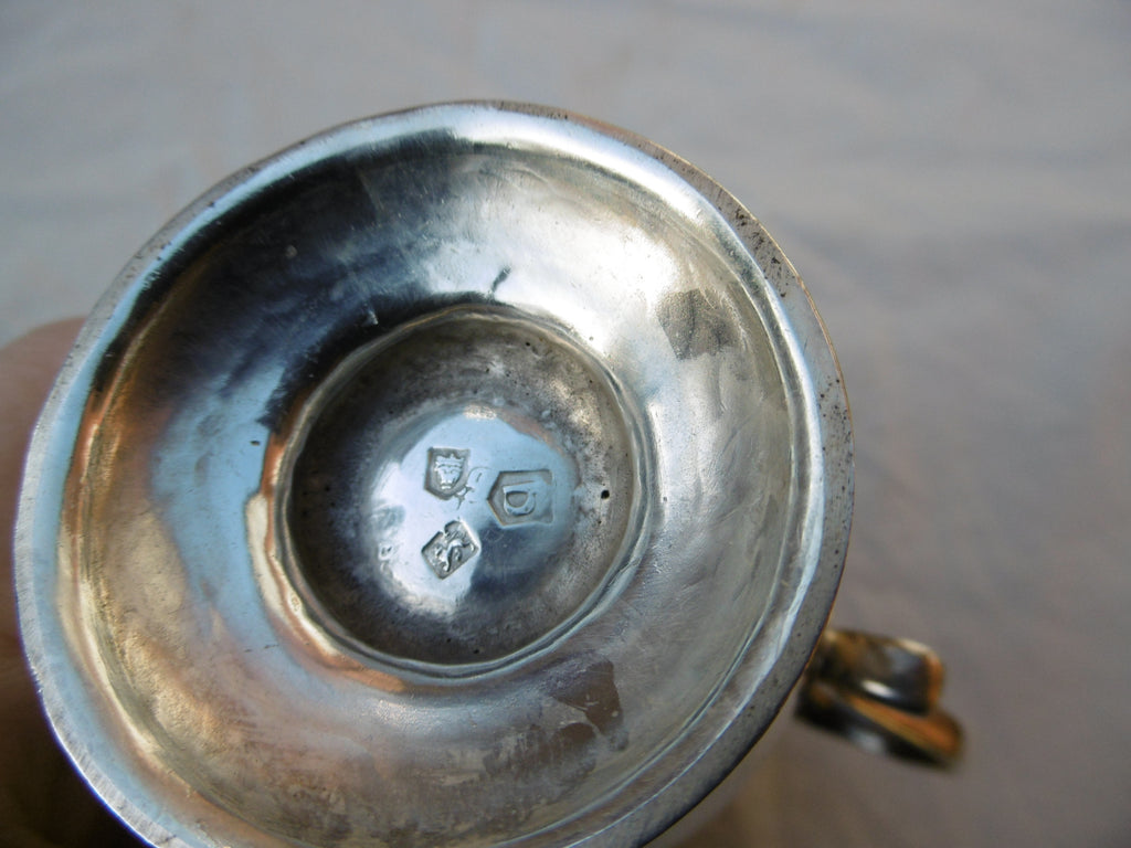 This is a lovely jug made in London in 1737 by maker?D, it is in very good condition, nice clear date letter, the maker is hard to read as it has been overstruck by the Leopards head, it is 8cms high and weighs 78 grams