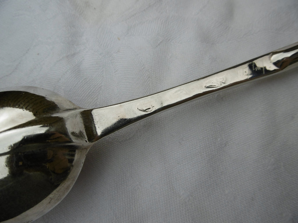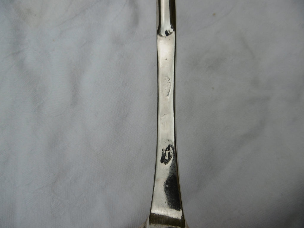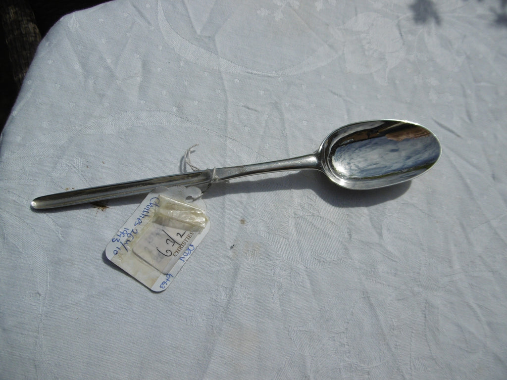 This is a rare marrow spoon made in Dublin in 1737 by Joseph Teafe. It is in very good condition, nice bowl and rat tail, the hallmarks rubbed but readable Harp and maker the date letter is a bit more rubbed but I am pretty sure its 1737 and that is how it was described when sold at Christies in 1993 lot 63. The label is still on it.