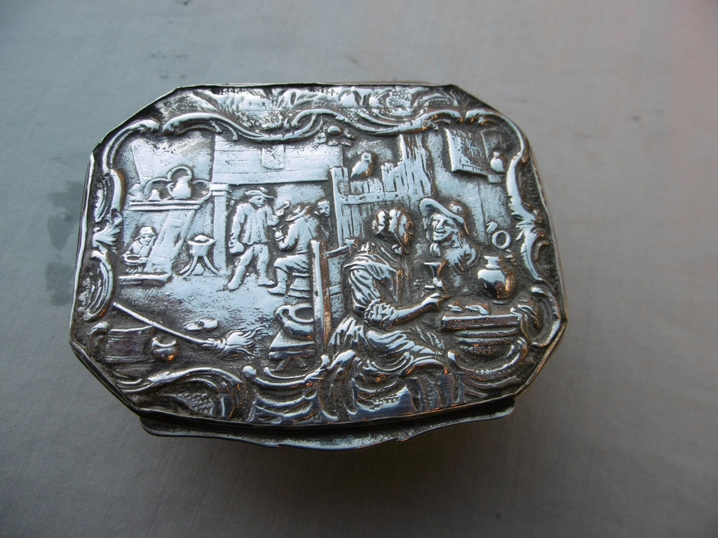 1740 large Georgian silver and Agate snuff box with Tavern scene.