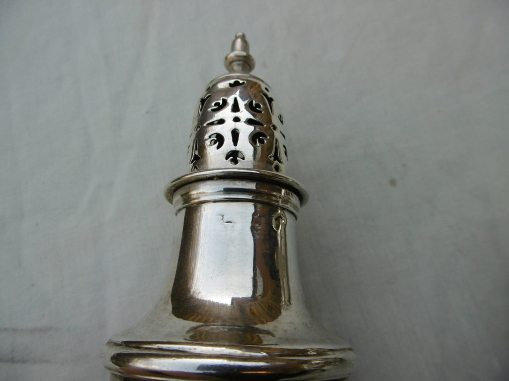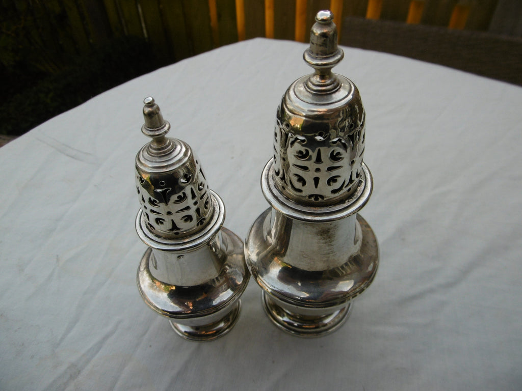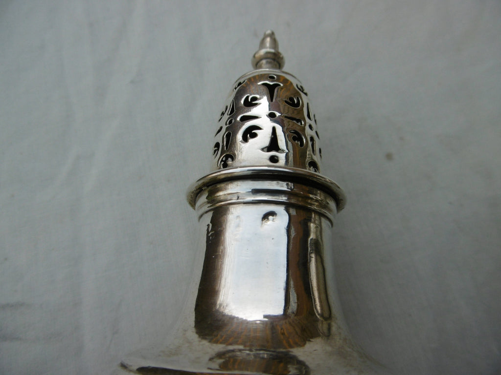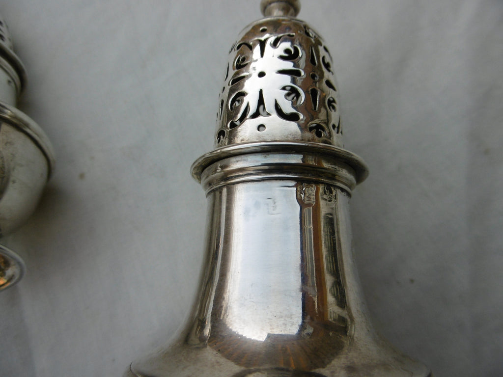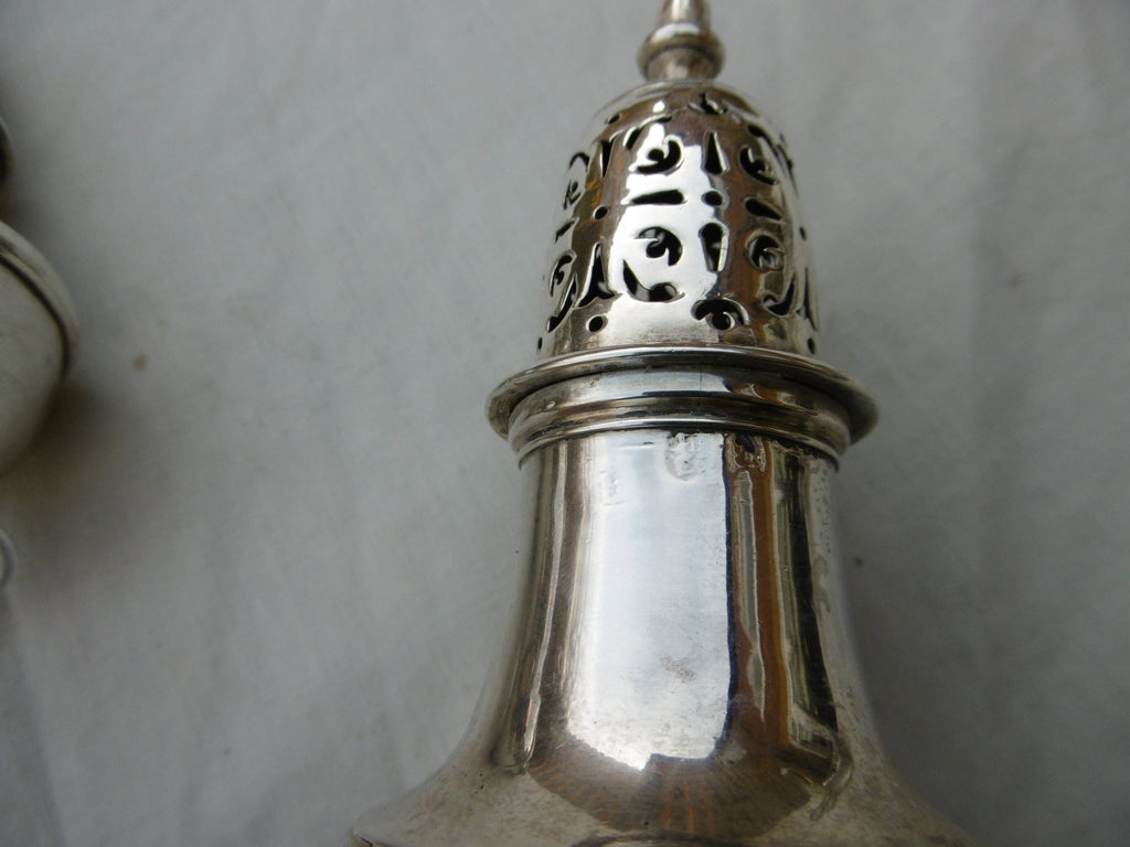 This is a very rare pair of castors made in Dublin in 1740 possibly by John Loughlin. They are in very good condition, nice pierced lids, they are the unusual Irish shape. The hallmarks are rubbed but I can see Hibernia and the harp on both , the date letter for 1740 on one and the maker ?L on the other. They are graduated, one is 11cms high the other is 13cms high and they weigh a combined 210 grams.