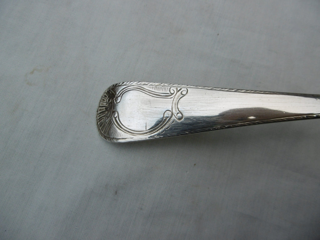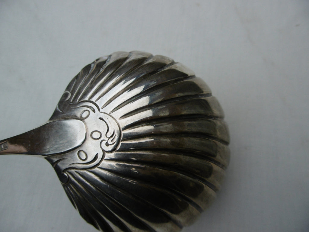 This is an impressive soup ladle made in Dublin in 1775 by Michael Keating. It is in very good condition , very clear hallmarks , it has a lovely shell bowl and feather edge decoration. It is 34cms long and weighs 155 grams.