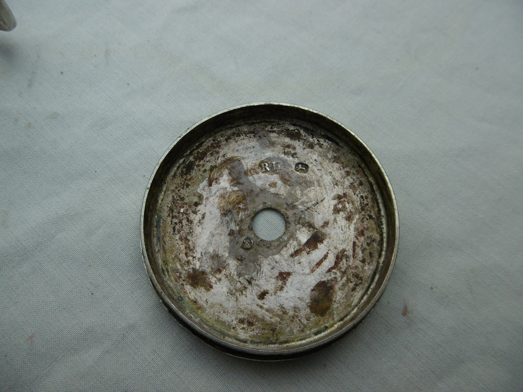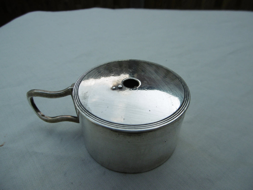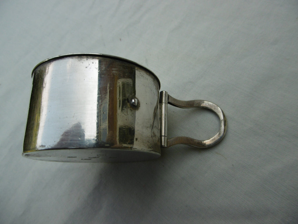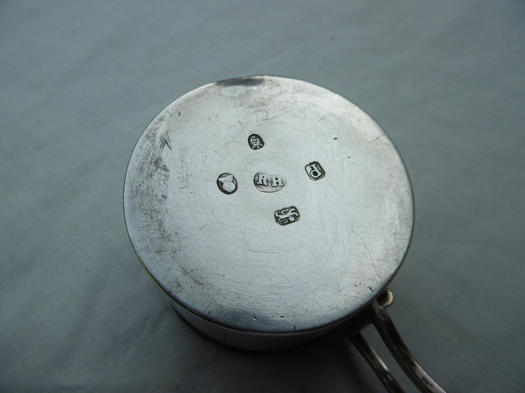 This is a really nice box made in London in 1790 by Robert Hennell. It is in very good condition, nice folding handle and lift off lid. It is fully hallmarked under the base with matching makers mark in the lid. It is 5cms diameter and weighs 70 grams.