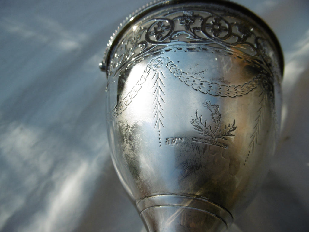This is a very attractive basket made in London in c1790 by William Plummer. It is in very good condition. the hallmarks are rubbed but the makers mark is clear, it has lovely beaded and bright cut decoration, it has 2 thistle crests and a clear glass liner. It is 12cms high excluding the handle and has 120 grams of silver.