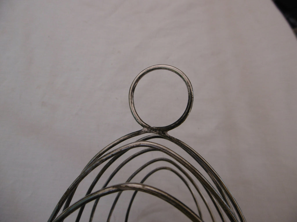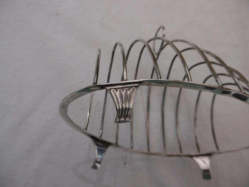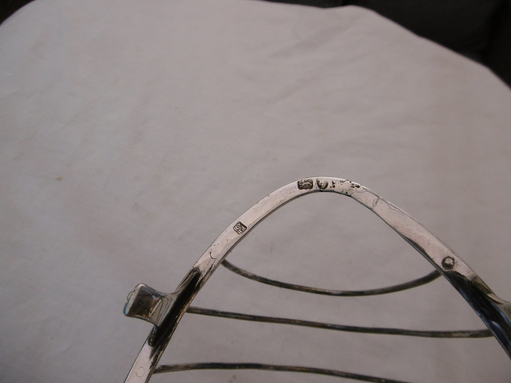 This is a very stylish toast rack made in London in c1800 by Peter and Anne Bateman. The hallmarks are clear maker but the date letter is obscured under a minor repair in the rim. It has a lovely loop handle and reeded feet, it is 18cms long x 16cms high and weighs 120 grams.