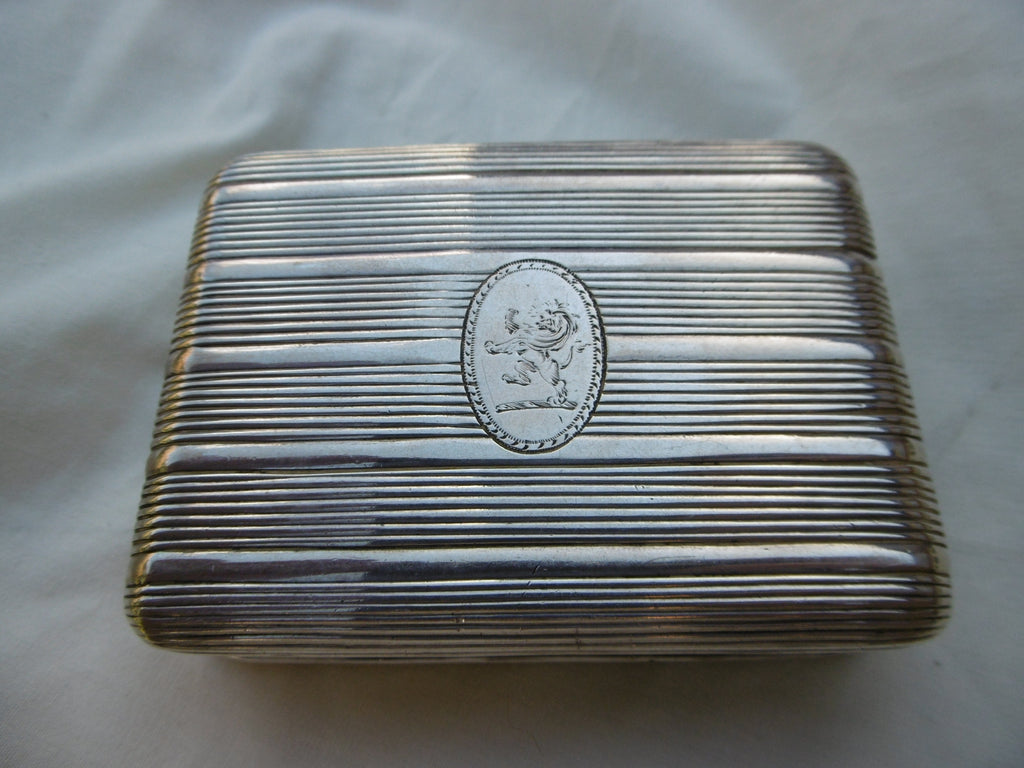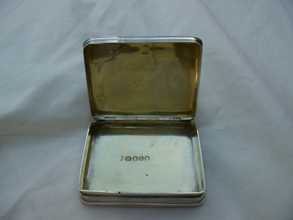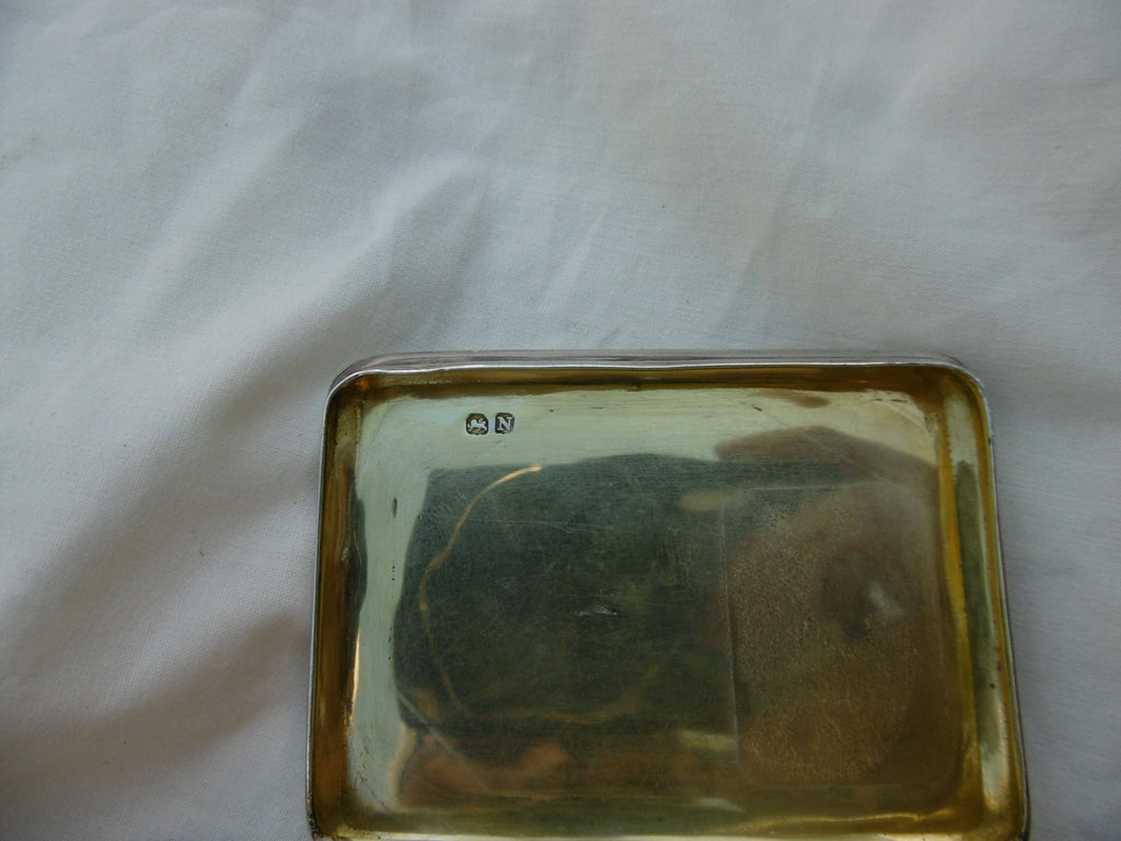This is a really good quality snuff box made in London in 1808 possibly by William Eley. It is in very good condition, very clear hallmarks, it has a lovely cast plaque of two riders jumping a fence on the lid and a lovely period crest on the base. It is 75mm long and weighs a heavy 110 grams.