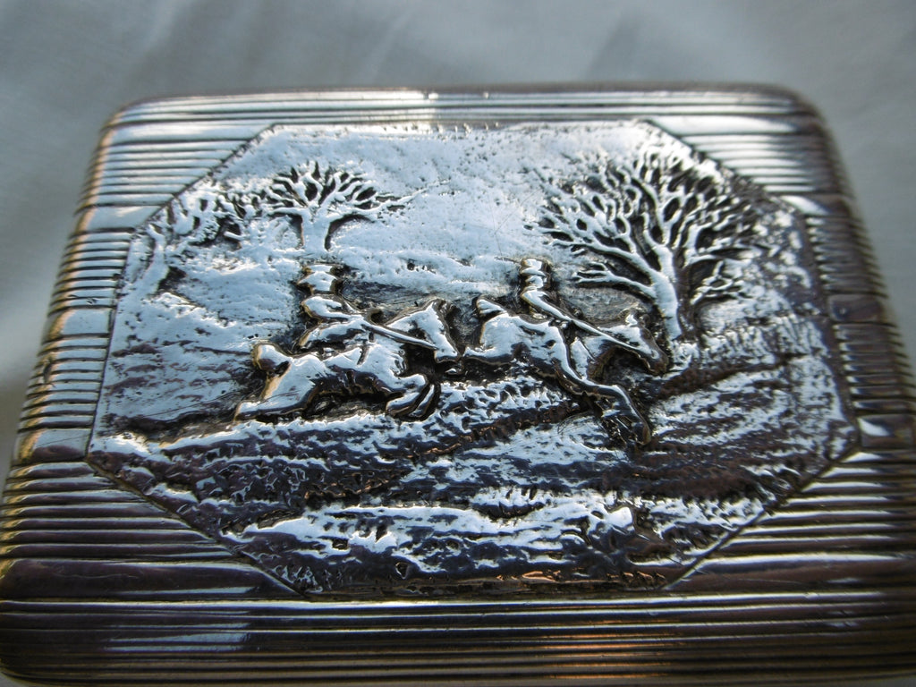 1808 fine Georgian snuff box with cast lid of hunting scene and crest 110g