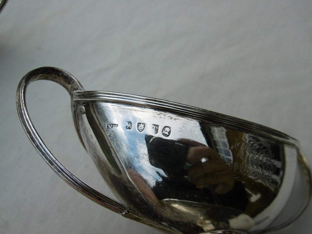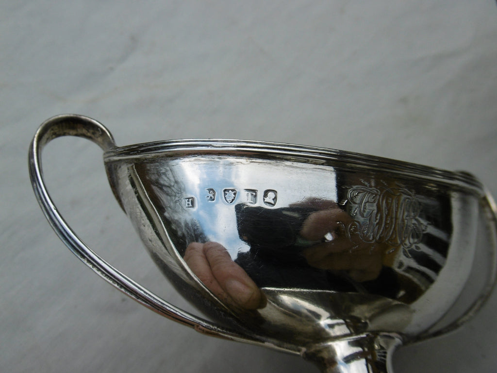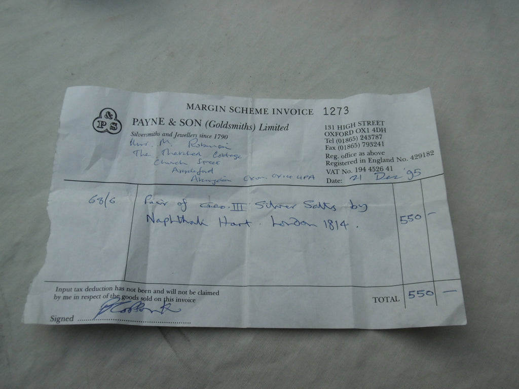 This is a fine pair of salts made in London in 1814 by N Hart. They are in very good condition with nice hallmarks , they have a Bulls head crest on one side and initials on the other side. They are 14cms wide and weigh 212 grams the pair, they come with an invoice from 1995 with a purchase price of £550