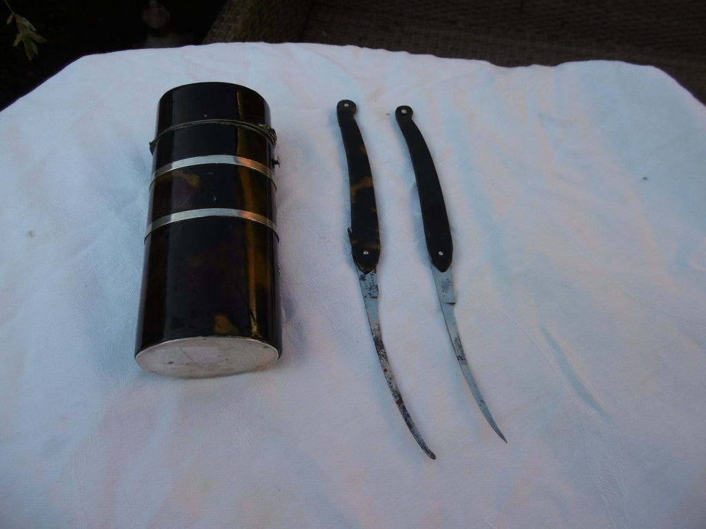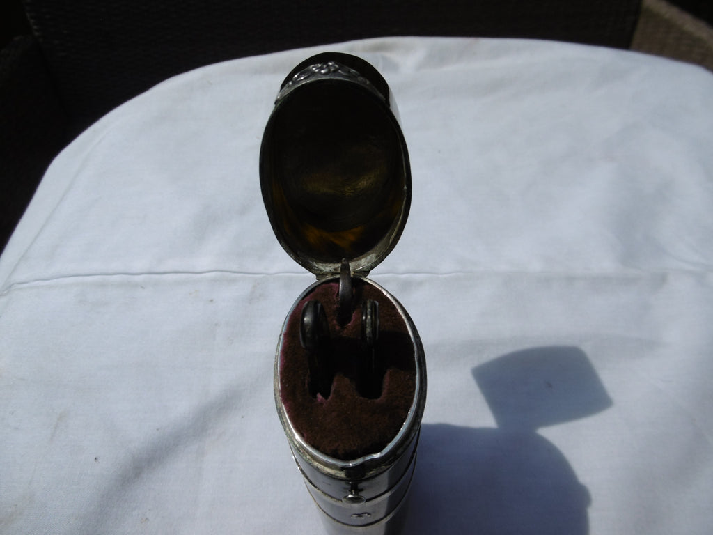This is a beautiful Tortoiseshell etui made in c1820 , it is really well made , the shell is in very good condition and it has silver mounts, it contains 2 period razors , one is marked Savigny & Co London, it is 12cms high