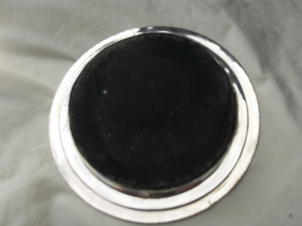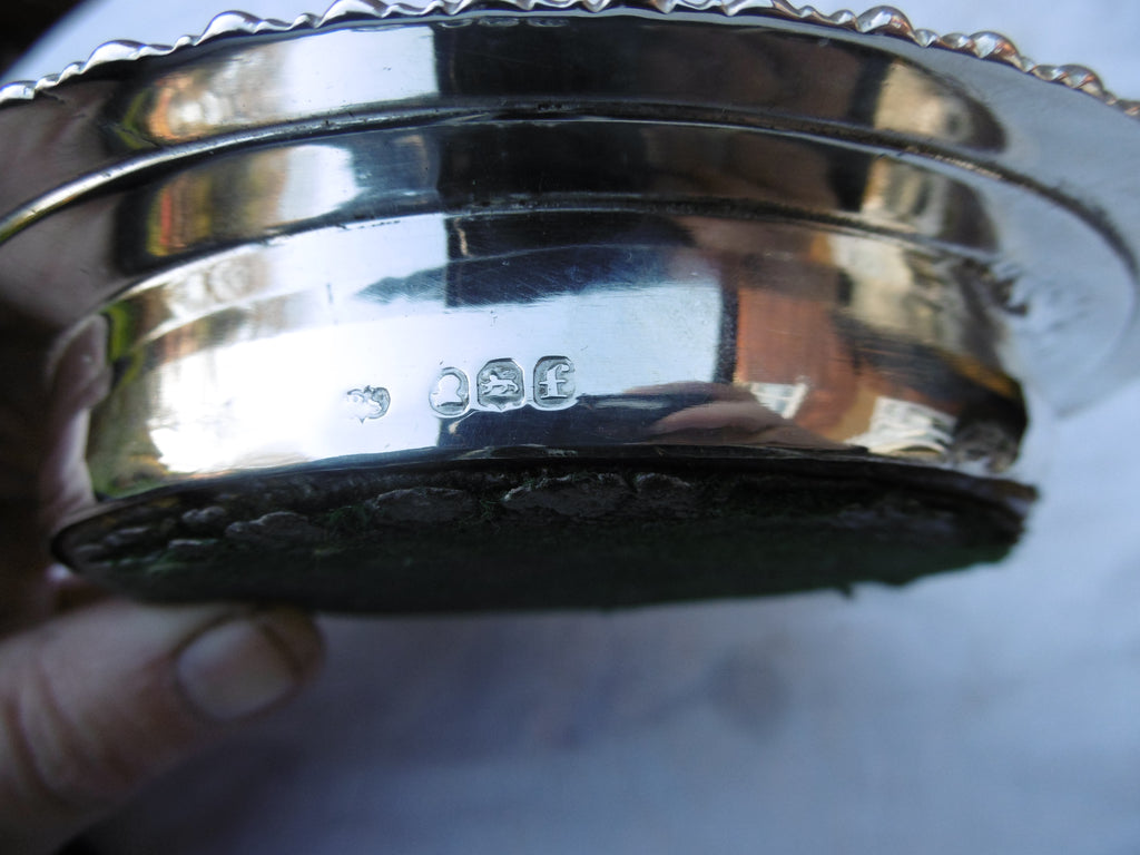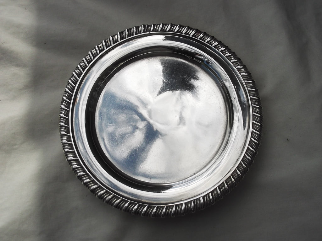 This is a lovely teapot stand made in London in 1821 by Paul Storr. It is in very good condition, nice clear hallmarks, it is silver over a wooden base. It is 145mm outside diameter and 100mm inside diameter.